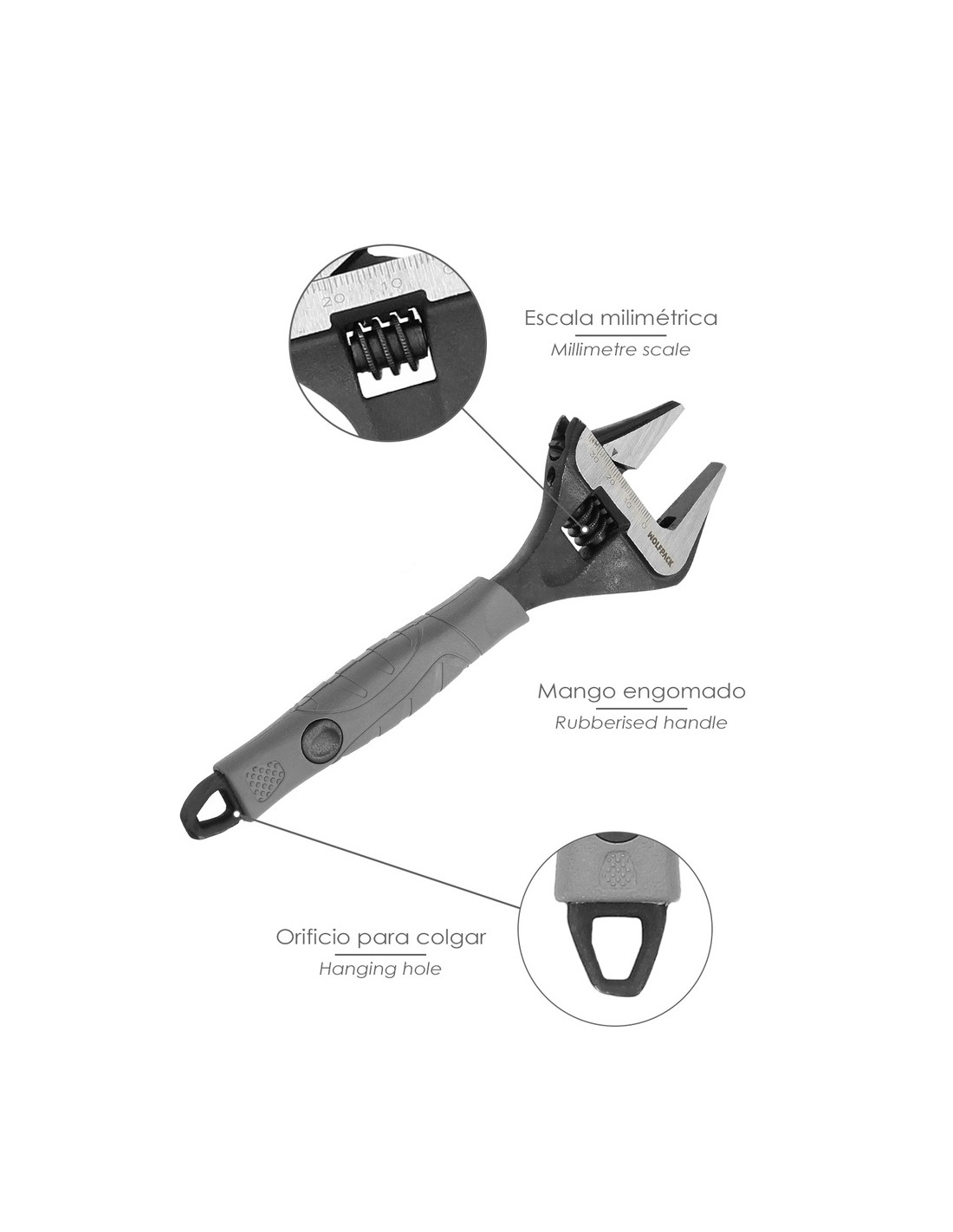 - Artículo también conocido como llave inglesa, llave de expansión, llave de tuercas ajustable, llave de tuercas, llave universal