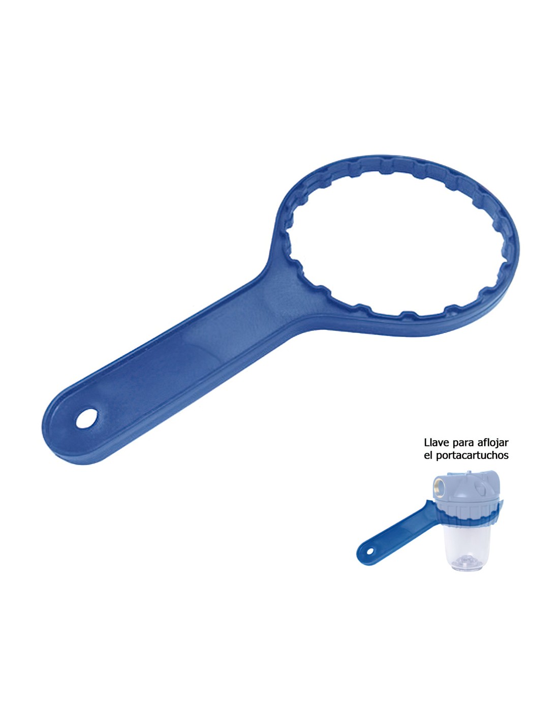 Llave apertura cierre porta cartuchos - Llave para abrir y cerrar el filtro de agua. - Material plástico azul. - De fácil manejo. - Articulo tambien conocido como filtro agua, porta filtros.