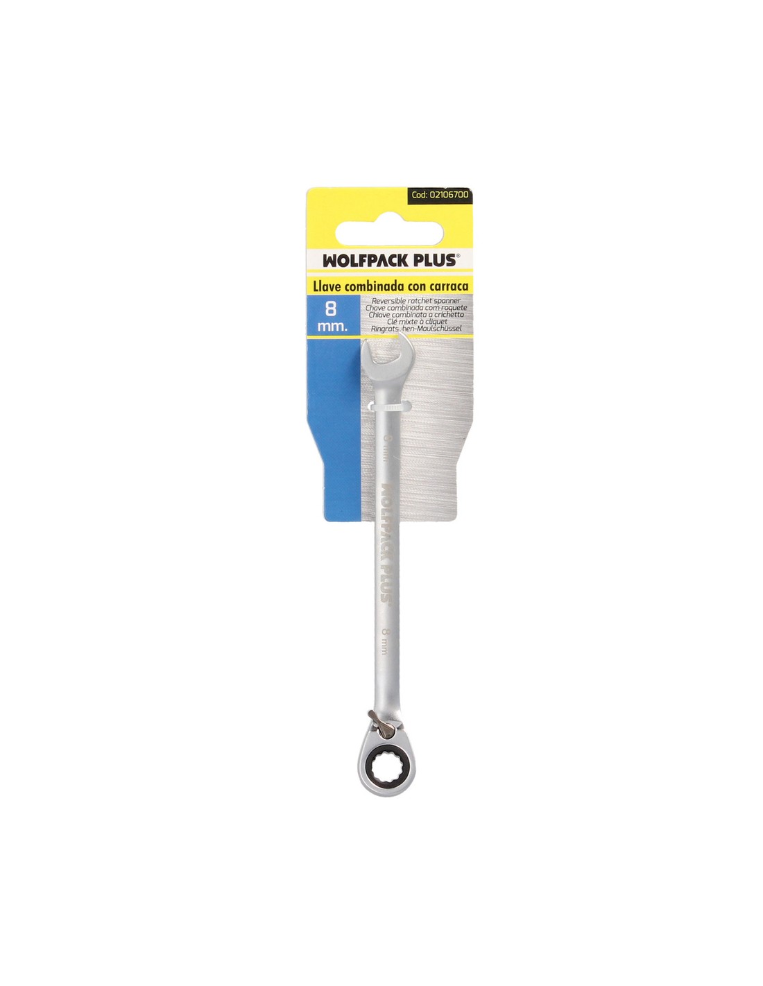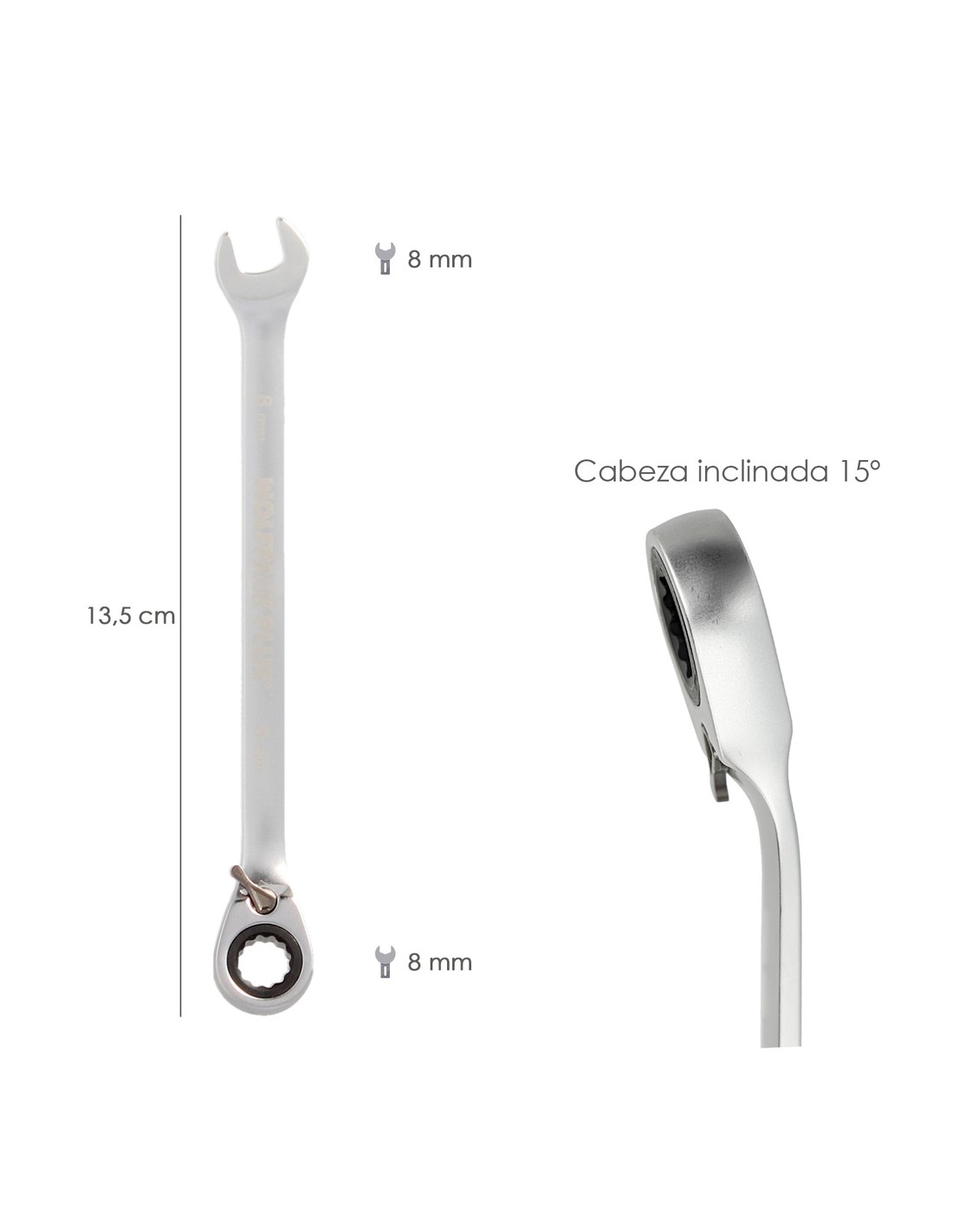 Llave combinada con carraca - Medida: 8 mm. - Longitud: 135 mm. - Acero al cromo-vanadio aportandole mayor resistencia y duración. - Cabeza inclinada 15º. - Bocas pulidas y rectificadas. - Cabeza de cuello ancho.