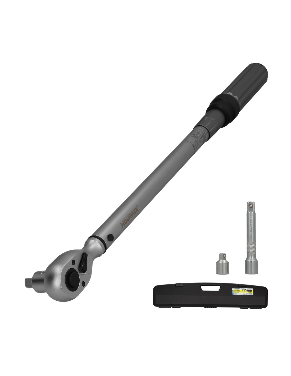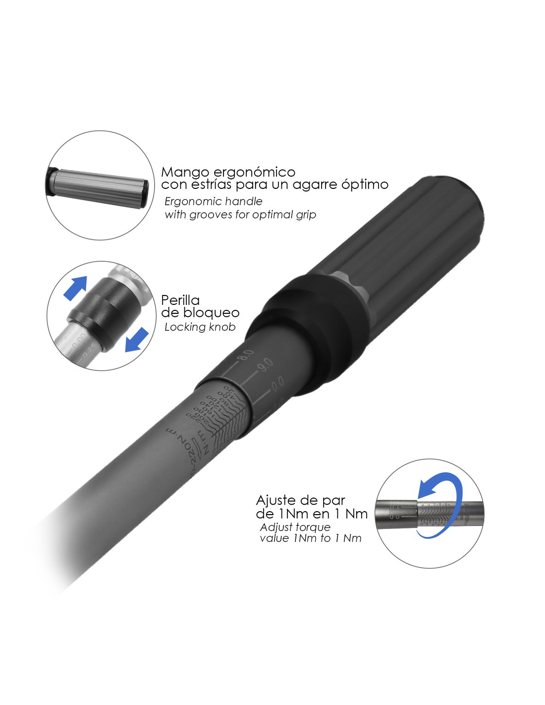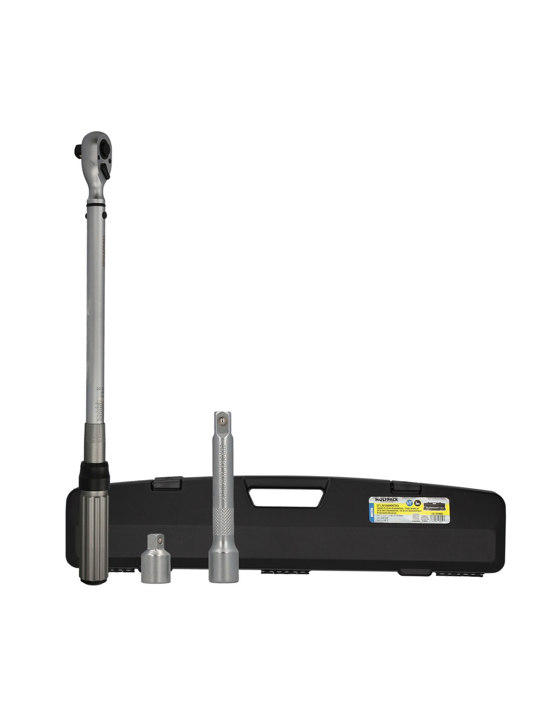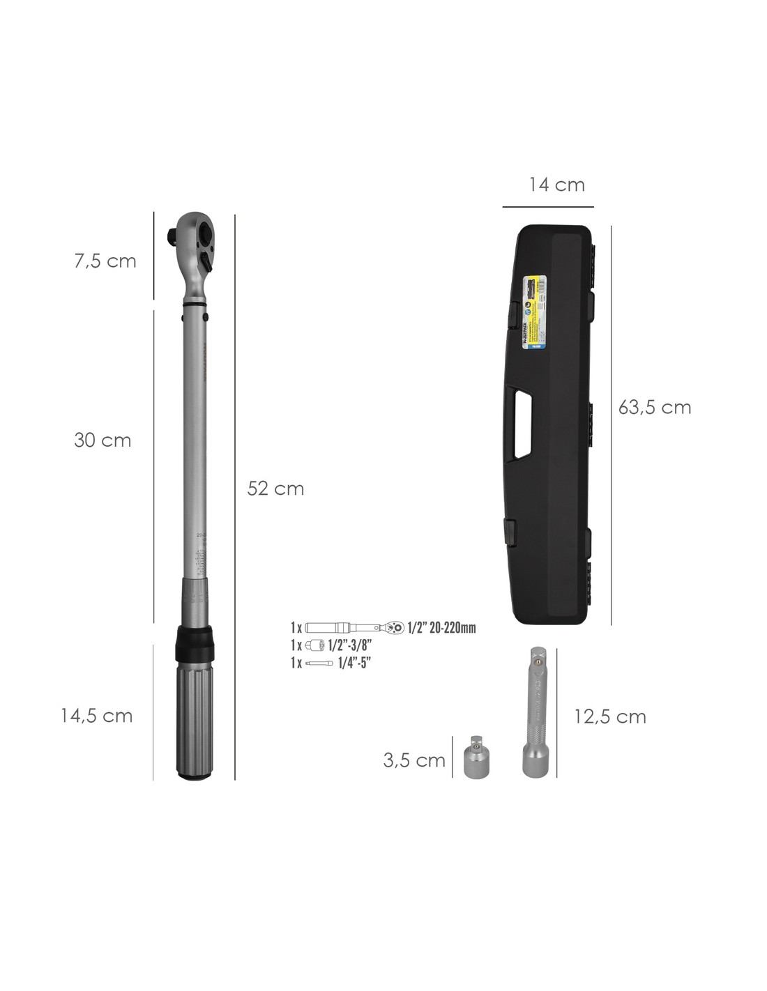 - Longitud llave: 52 cm. Cuadradillo de 1/2" con bola de fijación de los vasos. Cuenta con un par de 20 a 220 Nm, con ajustes de 10 en 10 Nm y microajustes de 1 en 1 Nm.