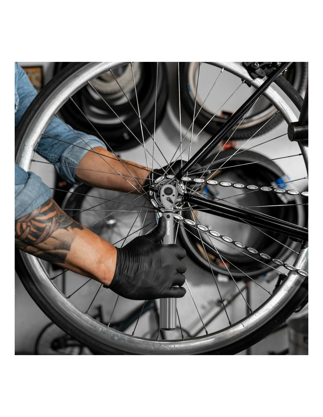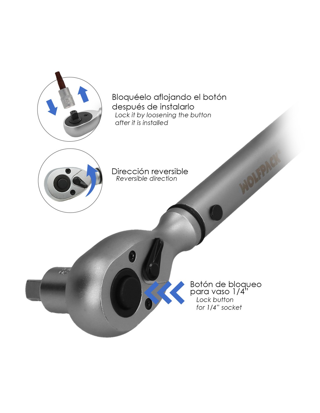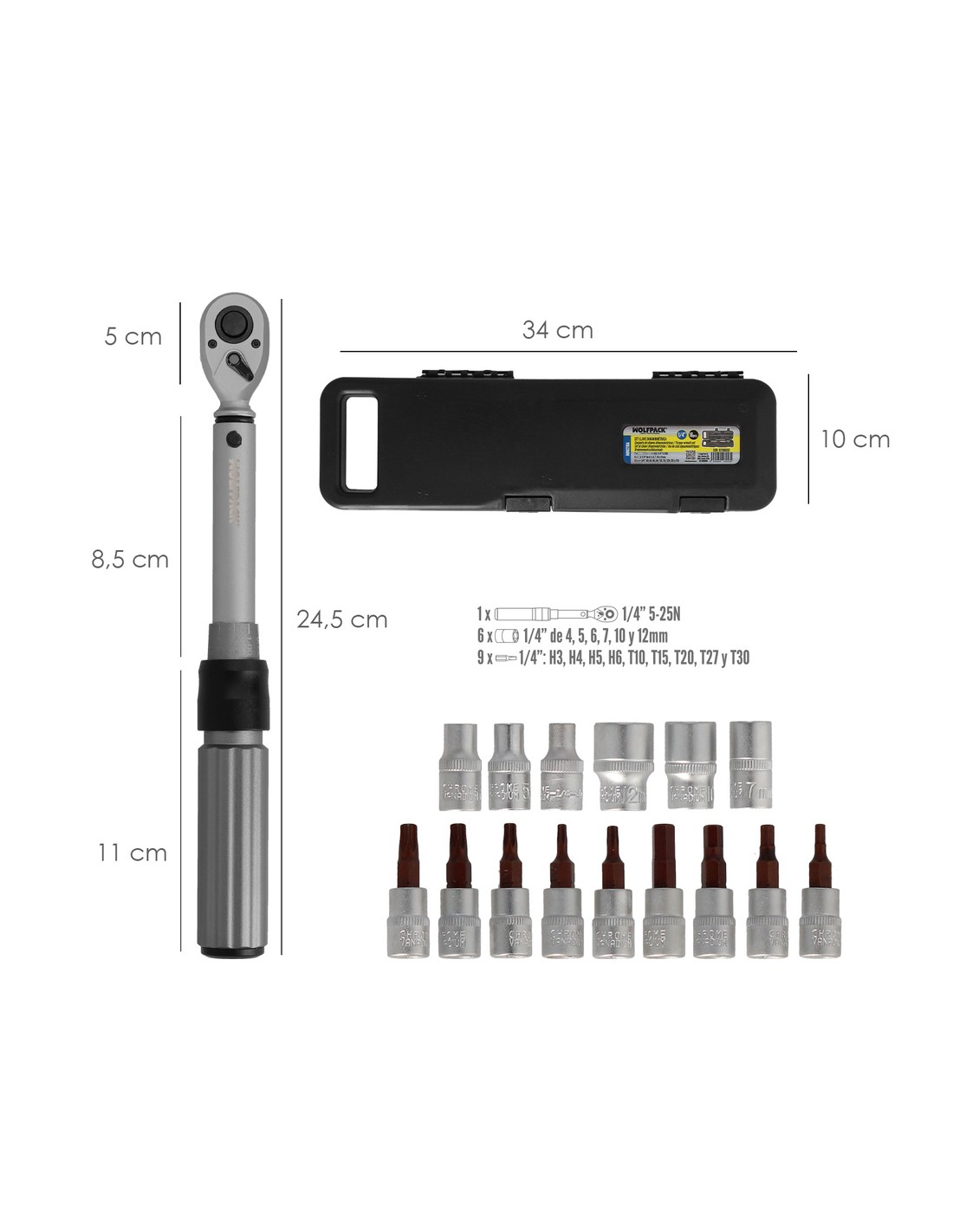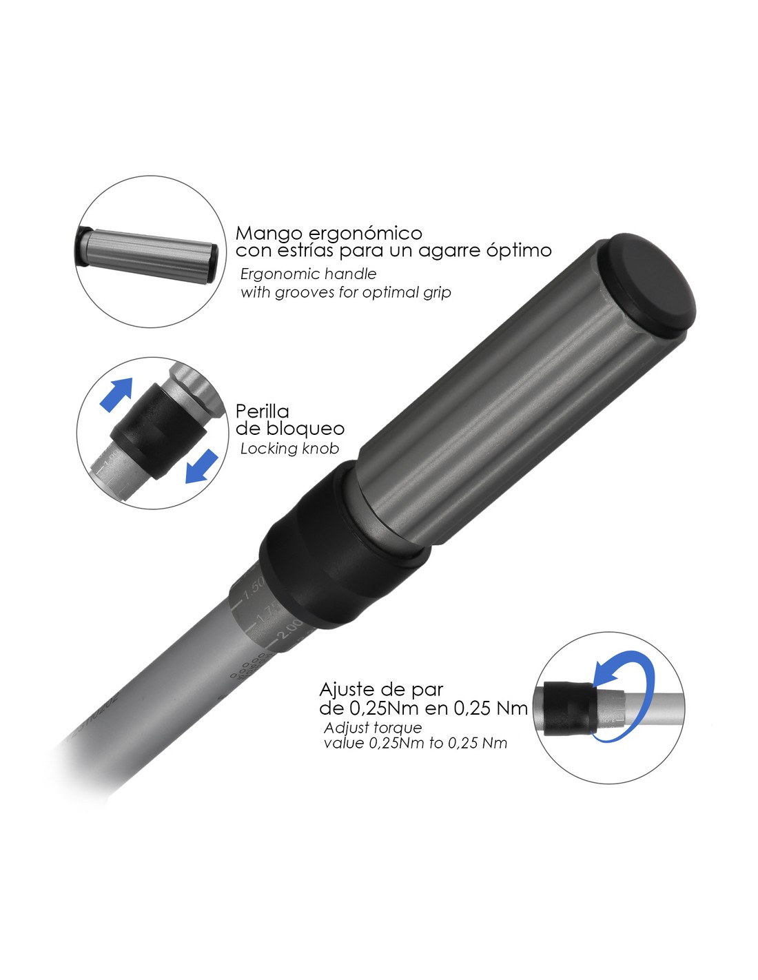 - Cuenta con un par de 5 a 25 Nm, con ajustes de 2,5 en 2,5 Nm y microajustes de 0.25 en 0.25 Nm.