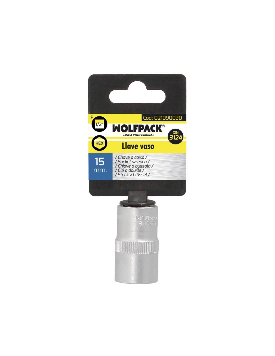 Llave Vaso 1/2" Hexagonal 15 mm. Perfil de 6 caras. Acero Cromo Vanadio, Aristas Redondas
