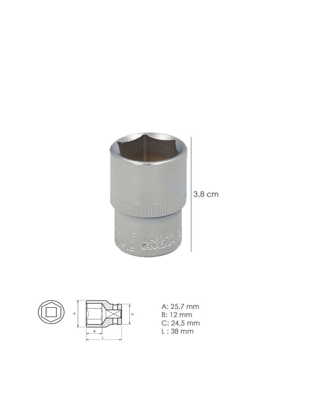 Llave Vaso 1/2" Hexagonal 20 mm. Perfil de 6 caras. Acero Cromo Vanadio, Aristas Redondas