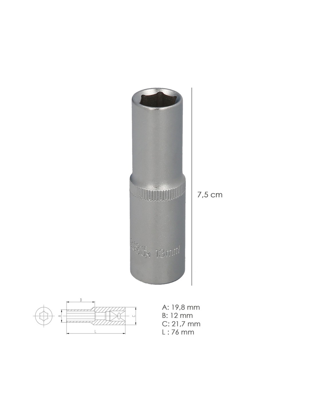 Llave Vaso 1/2" Hexagonal Larga 13 mm. Perfil de 6 caras. Acero Cromo Vanadio, Aristas Redondas