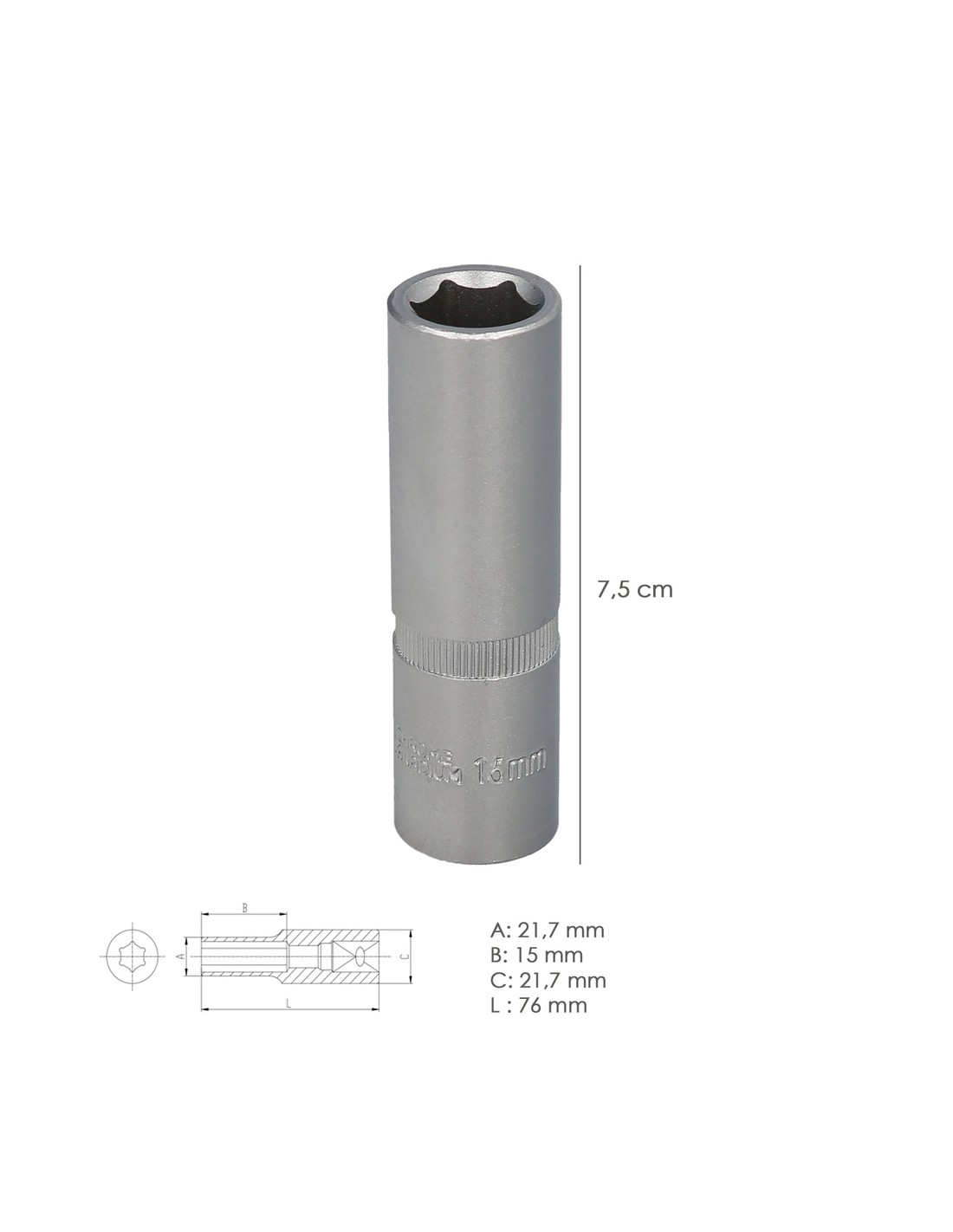 Llave Vaso 1/2" Hexagonal Larga 15 mm. Perfil de 6 caras. Acero Cromo Vanadio, Aristas Redondas
