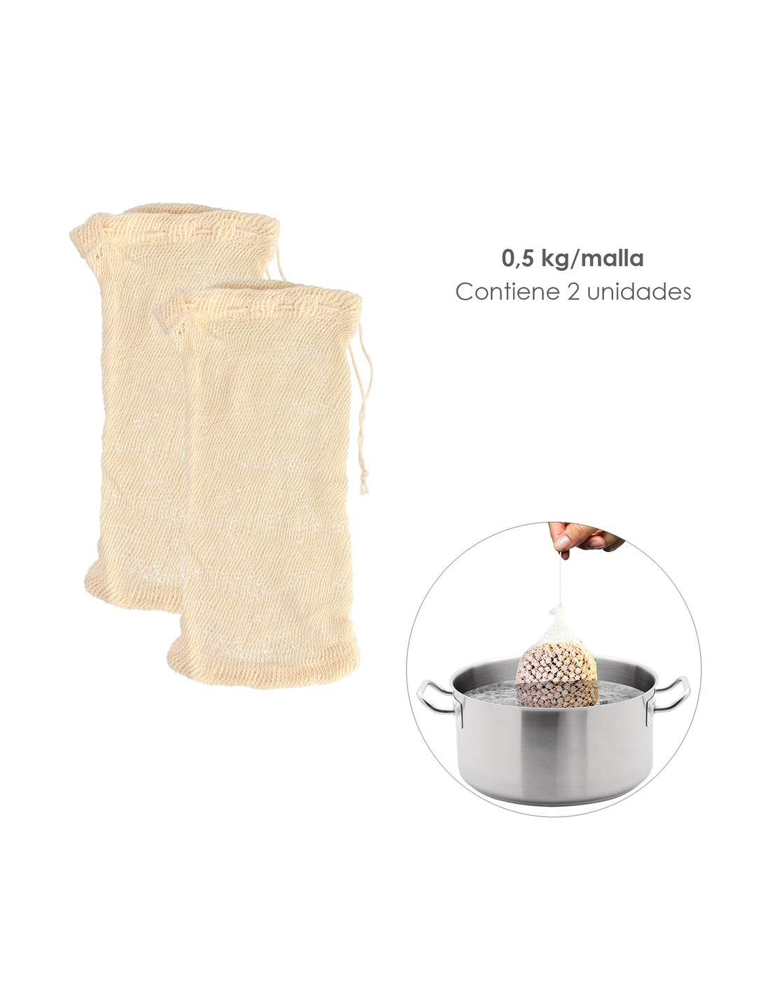 - Articulo conocido como malla garbanzos, malla cocer, bolsa cocer, bolsa cocción, bolsa cocer garbanzos, bolsa cocido, malla cocido.