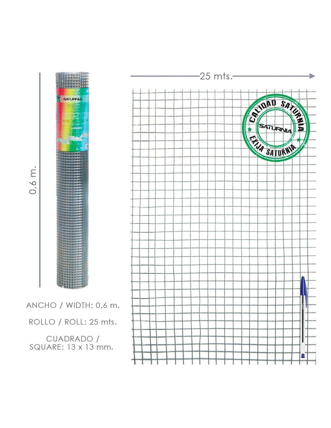 Malla Electrosoldada Galvanizada 13x13 / Altura 60 cm. Rollo 25 Metros. Uso Domestico