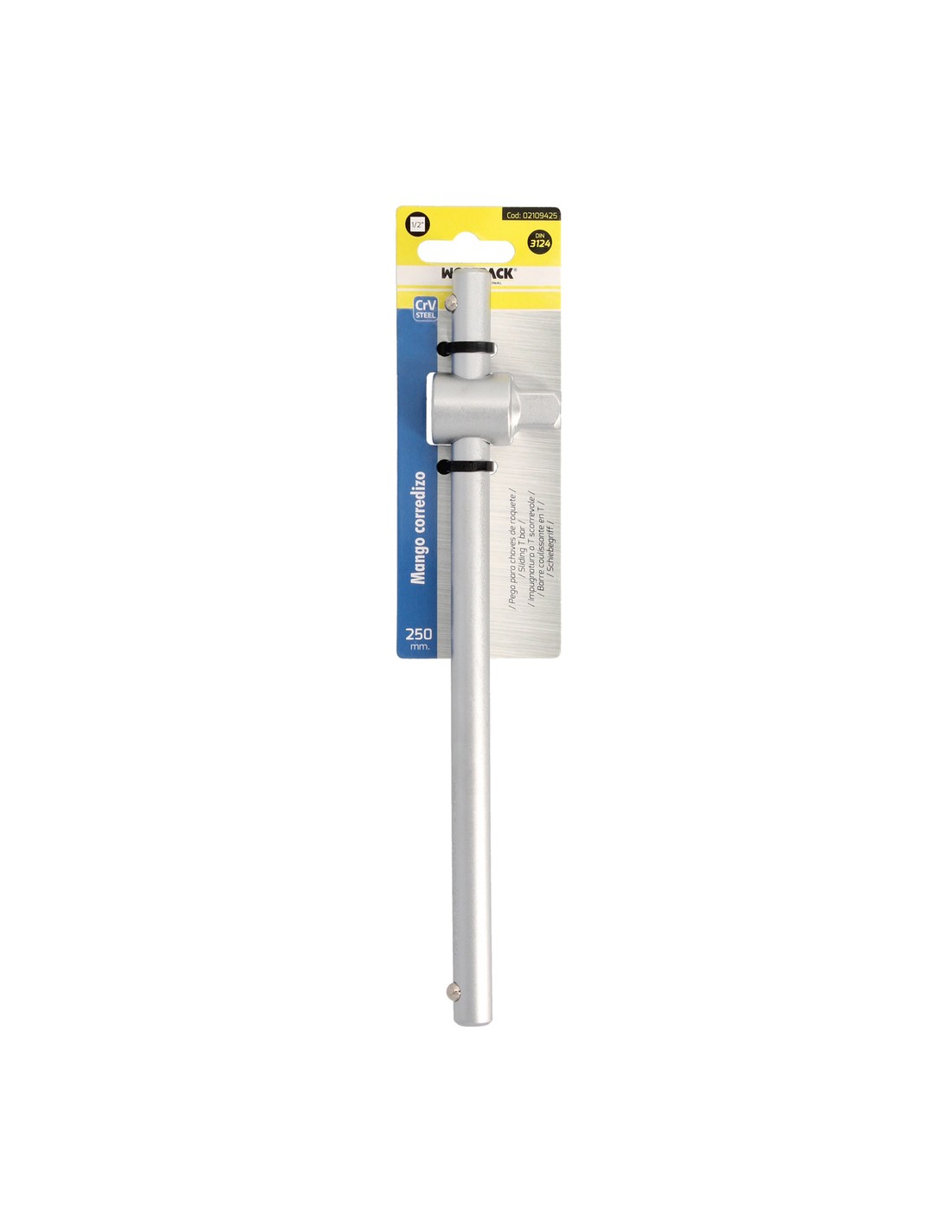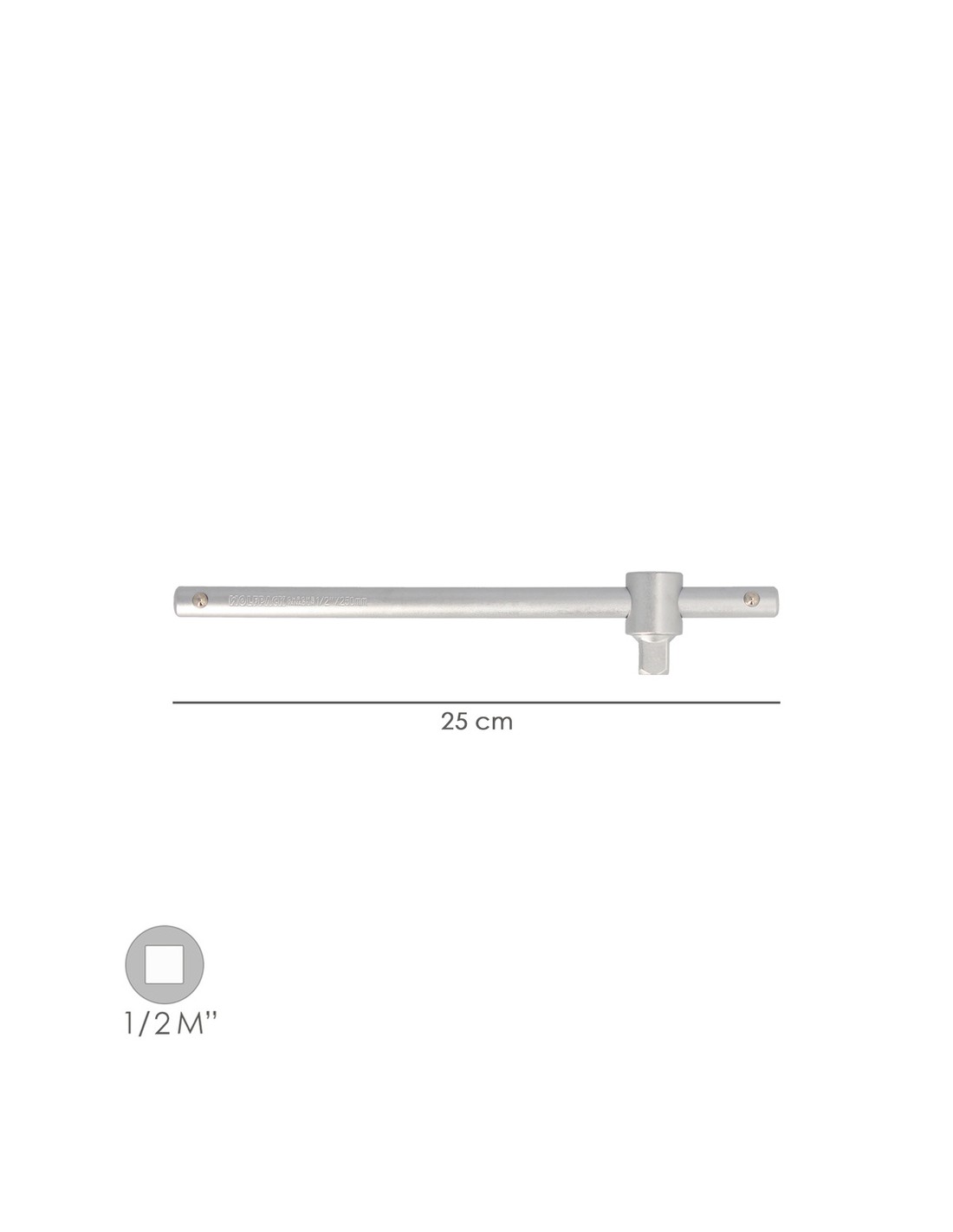 Mango corredizo - Cuadradillo 1/2". - Medida: 250 mm. - Fabricada en acero al Cromo Vanadio, aportándole una mayor dureza y resistencia. - Cumple con la normativa DIN 3122. - Aristas redondas. Soporta altos pares de apriete con minimo desgaste.