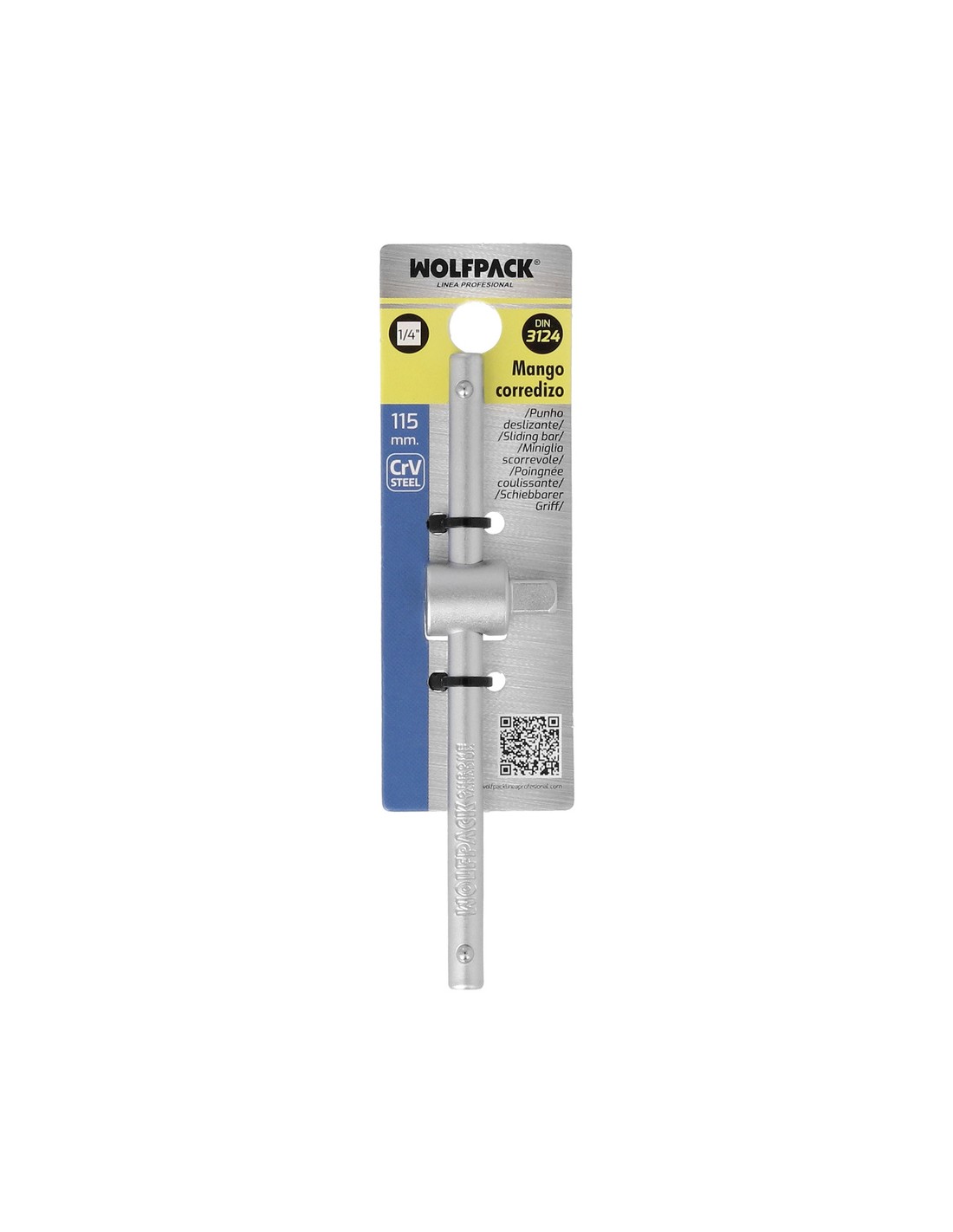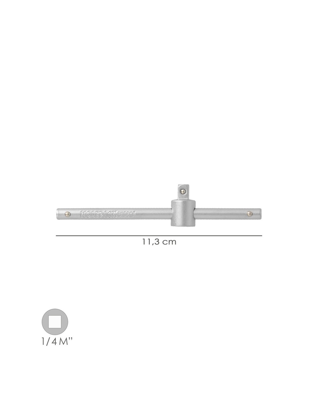 Mango corredizo - Cuadradillo 1/4". - Medida: 115 mm. - Fabricada en acero al Cromo Vanadio, aportándole una mayor dureza y resistencia. - Cumple con la normativa DIN 3122. - Aristas redondas. - Soporta altos pares de apriete con minimo desgaste.