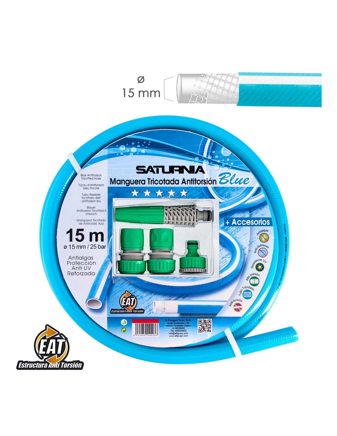 - Manguera de riego dotada de estructura antitorsion "EAT" para evitar dobleces y torsiones, garantizando mayor durabilidad y comodida de uso.