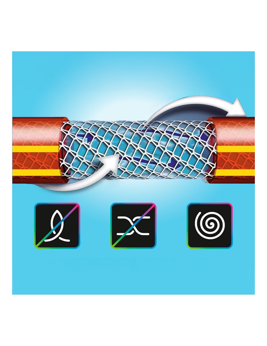 - Manguera de riego con tecnología "no torsion system" que evita todo tipo de dobleces y garantiza una alta durabilidad y comodidad de uso.
