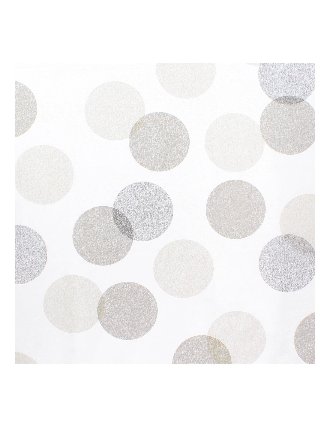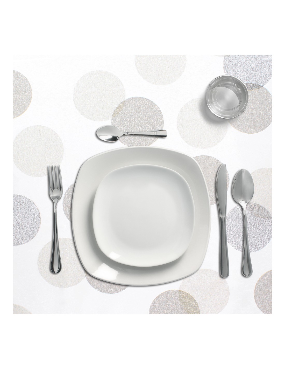 - Mantel Hule estampado en color blanco con formas circulares en tonos de gris y beige. Diseño moderno y elegante para cualquier ocasión.
