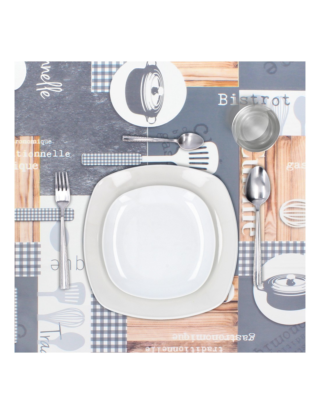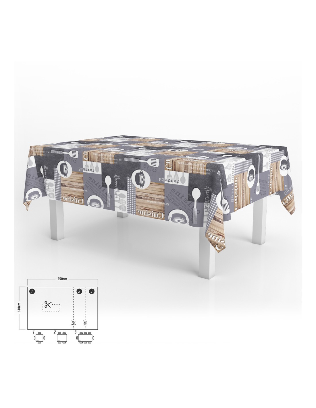 - Mantel Hule estampado en tonos grises y madera con formas de utensilios de cocina. Diseño moderno y elegante para cualquier ocasión.