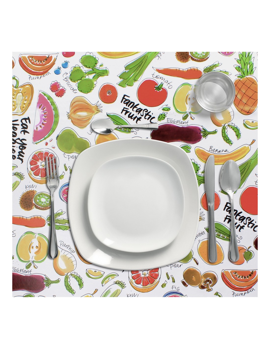 - Mantel Hule estampado en color blanco con formas de frutas divertidas en varios colores. Diseño moderno y elegante para cualquier ocasión.