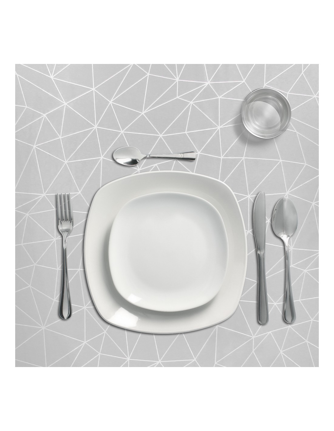 - Mantel Hule estampado en color gris con formas geométricas blancas. Diseño moderno y elegante para cualquier ocasión.