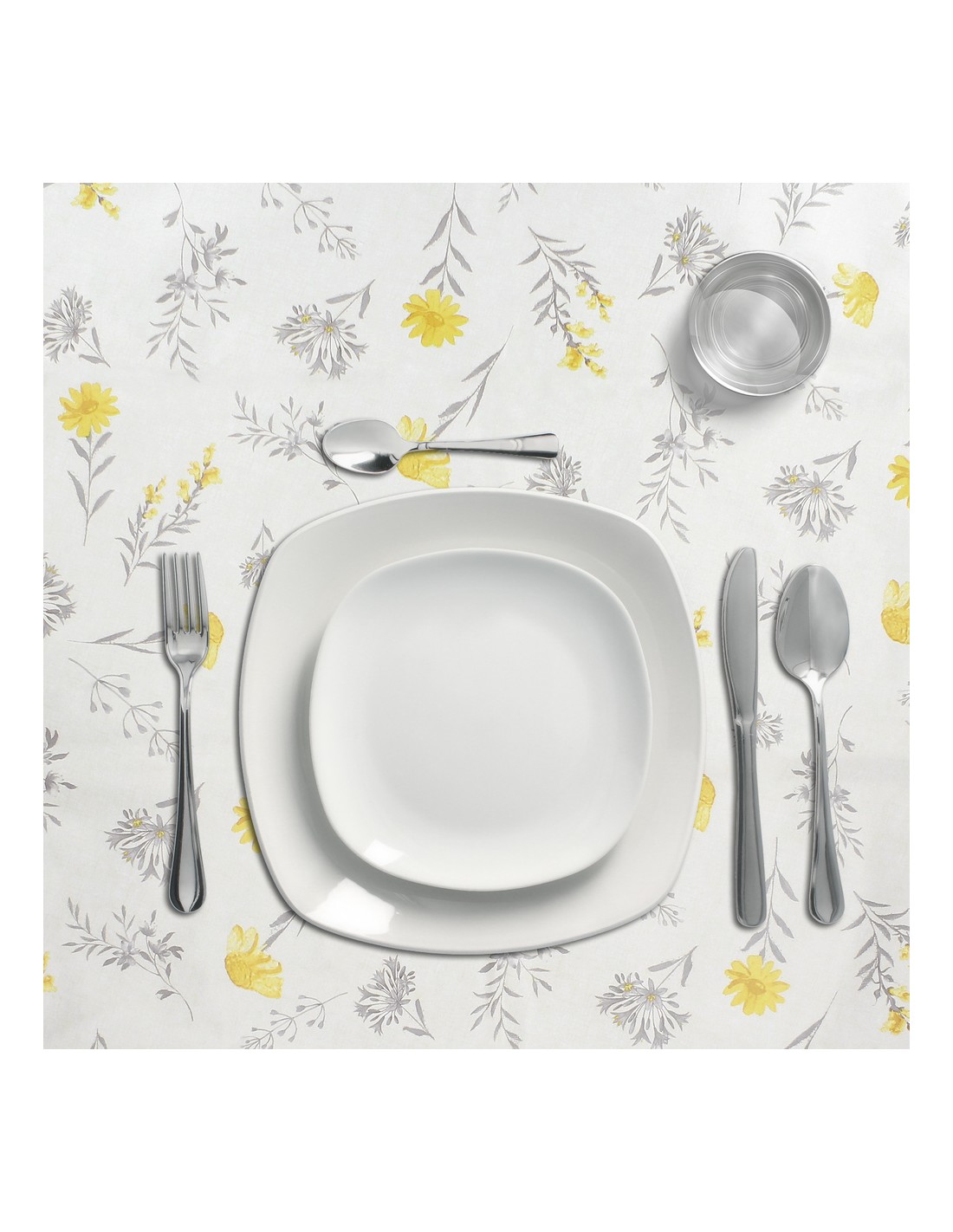 - Mantel Hule estampado en color gris con formas de flores amarillas. Diseño moderno y elegante para cualquier ocasión.