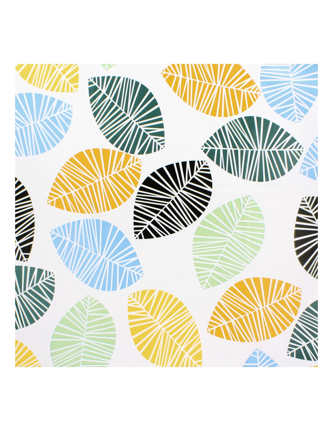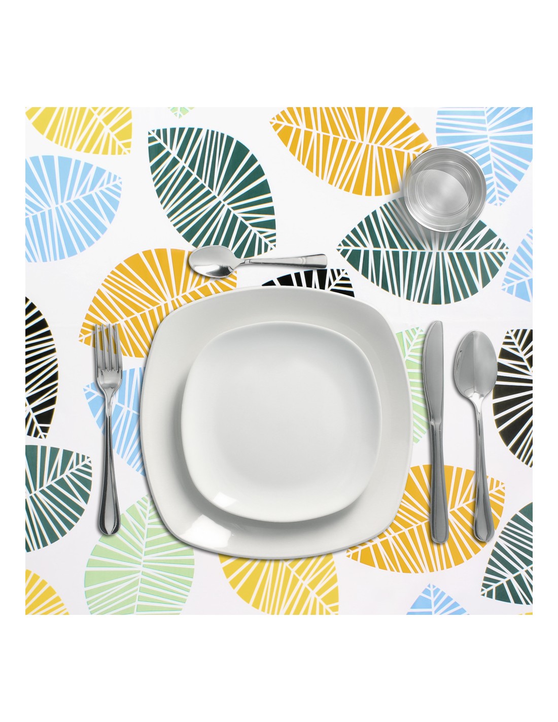 - Mantel Hule estampado con fondo en color blanco con formas hojas en varios tonos de color. Diseño moderno y elegante para cualquier ocasión.