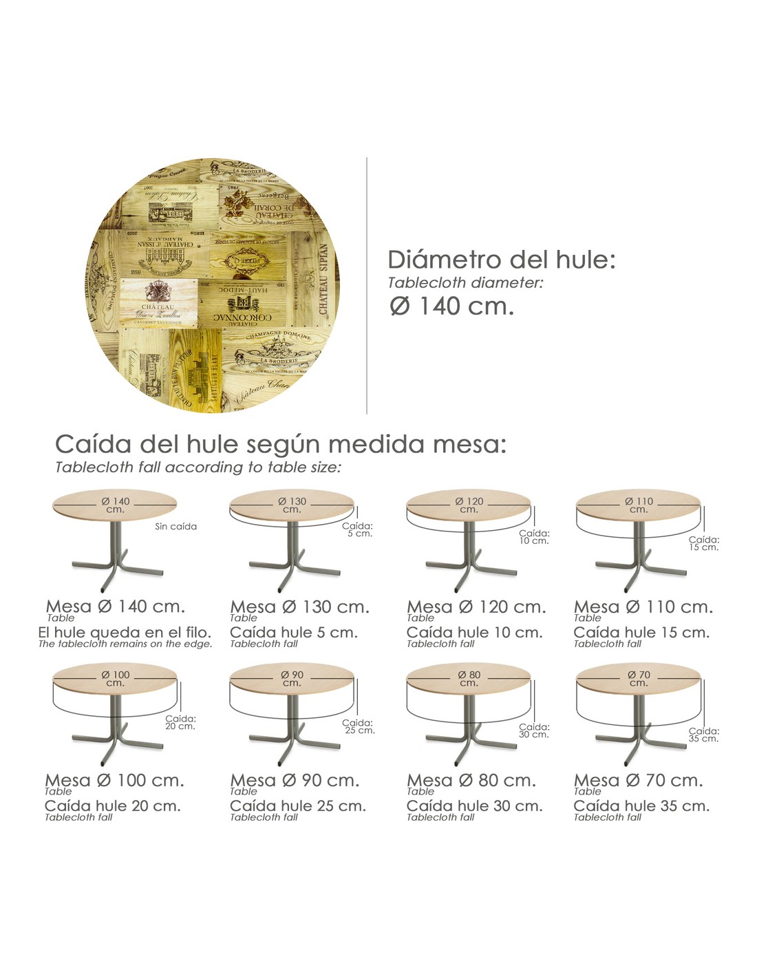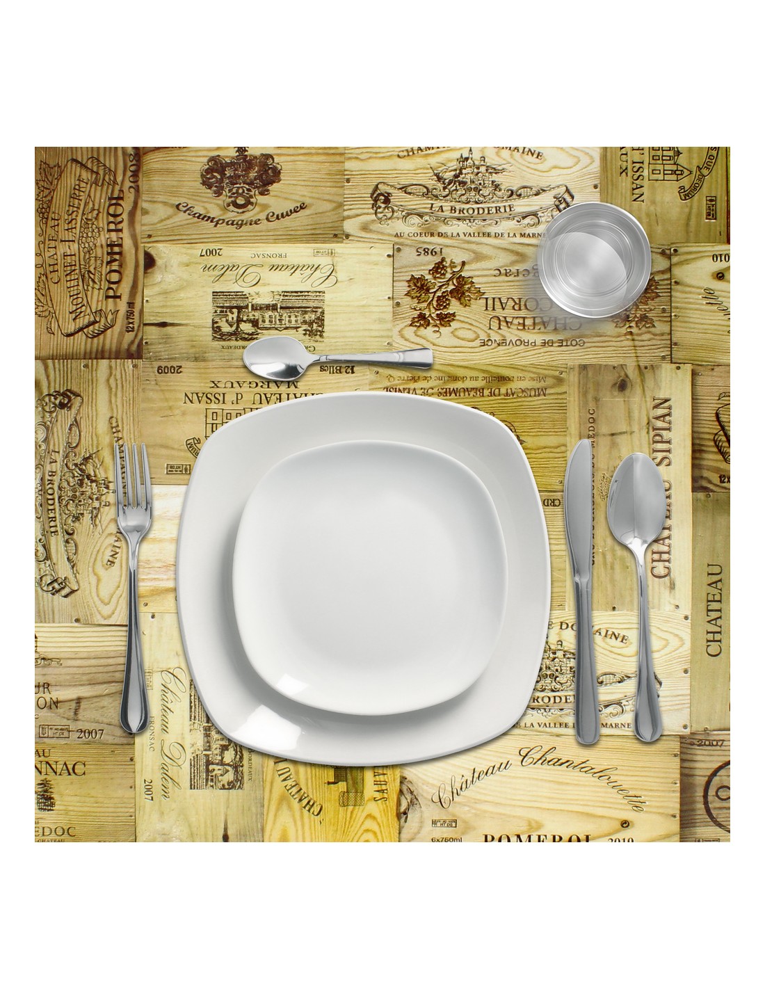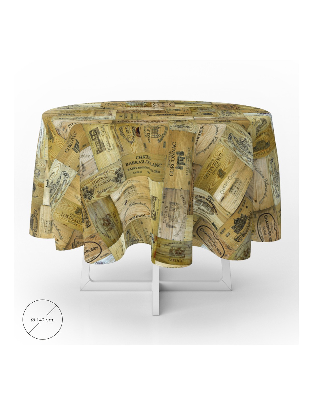 - Mantel Hule estampado en color madera imitando una composición cajas de vino. Diseño moderno y elegante para cualquier ocasión.