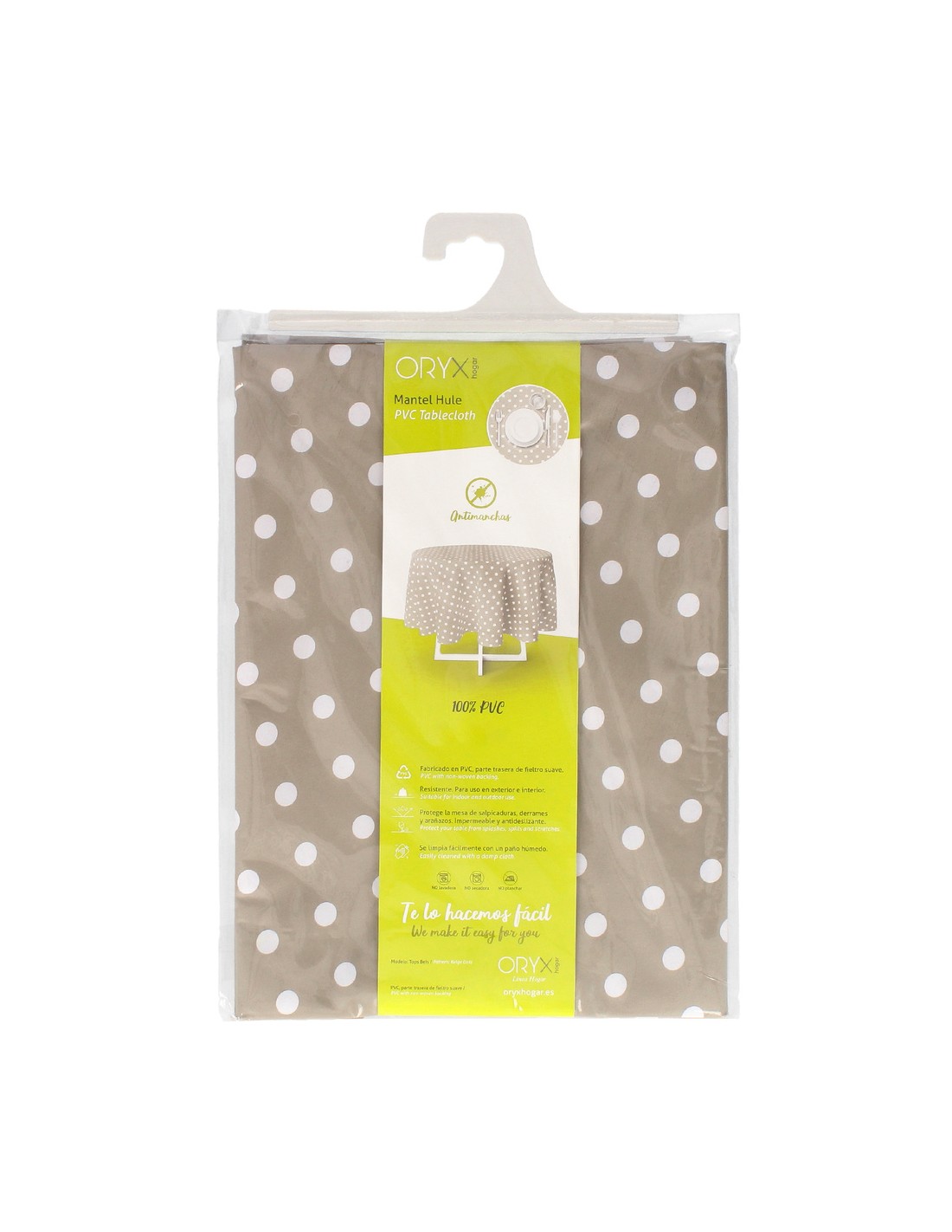 Mantel Hule Redondo Topos Beige Impermeable Antimanchas PVC Ø140 cm. Uso Interior y Exterior