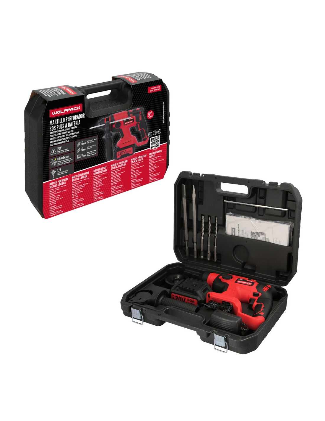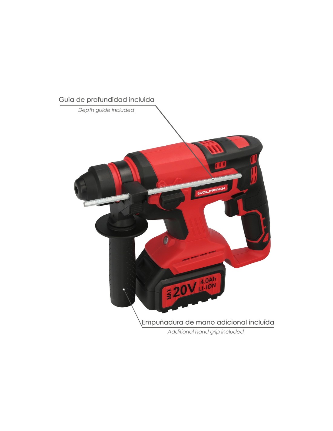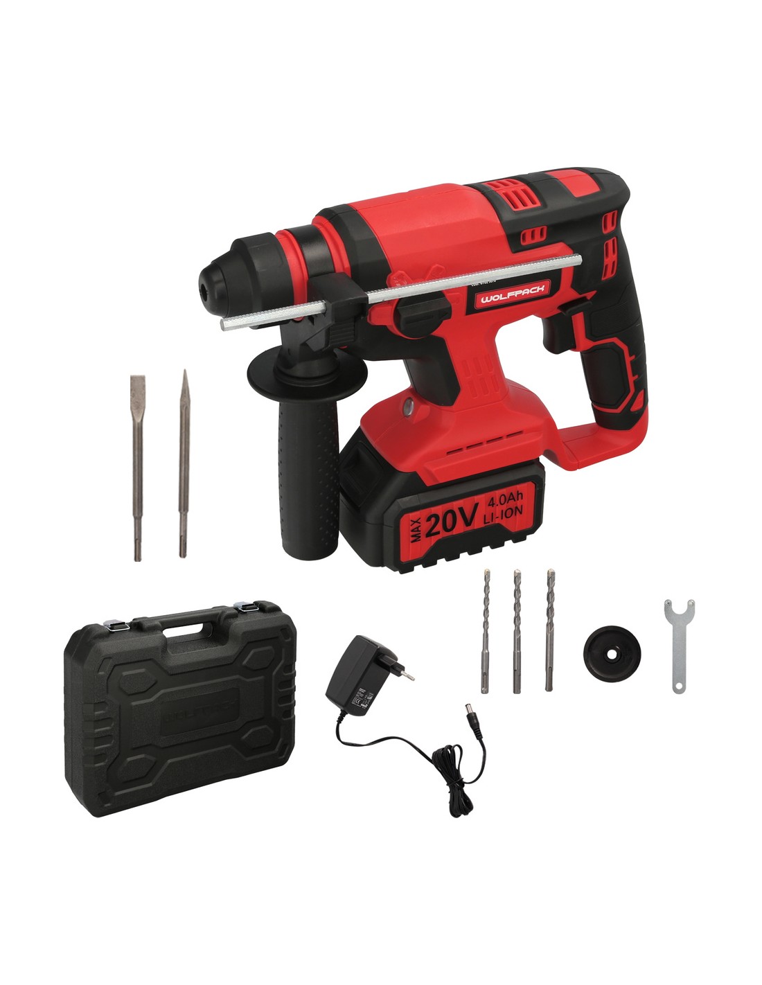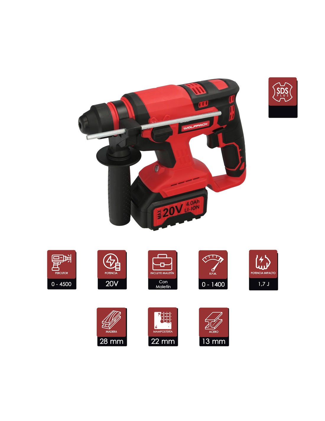 Este martillo SDS PLUS puede perforar hasta 13 mm en acero, 28 mm en madera y 22 mm en hormigón. Además, se incluyen diversos accesorios como batería, cargador, brocas SDS PLUS de diferentes tamaños, cincel plano, cincel punta, empuñadura lateral y guía metálica.