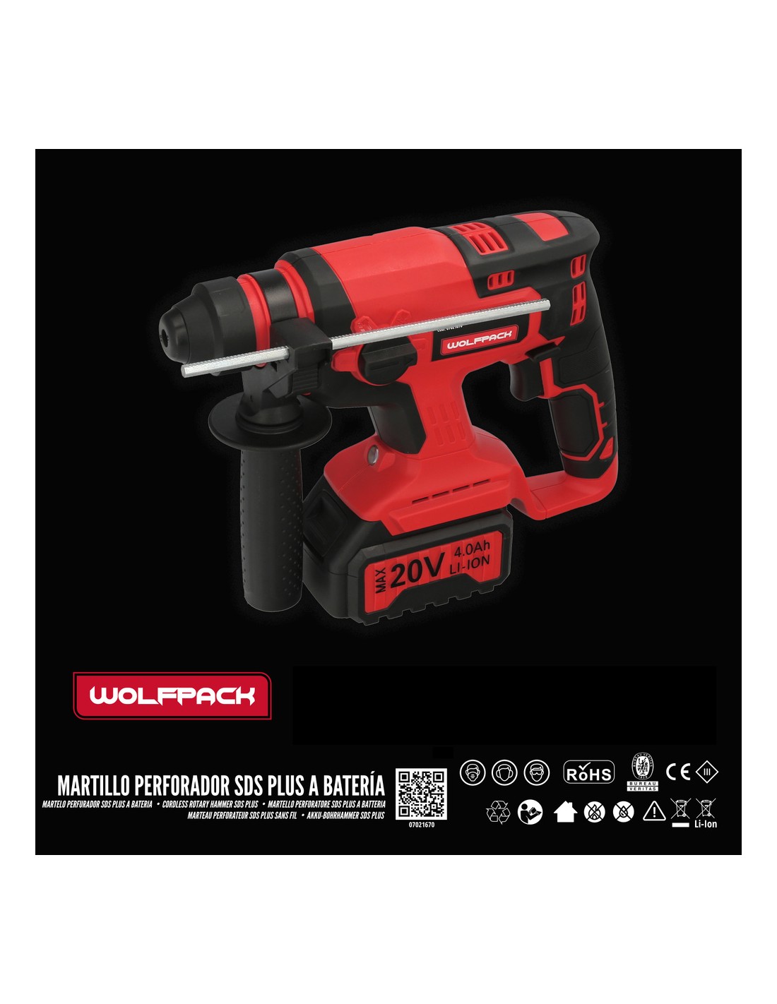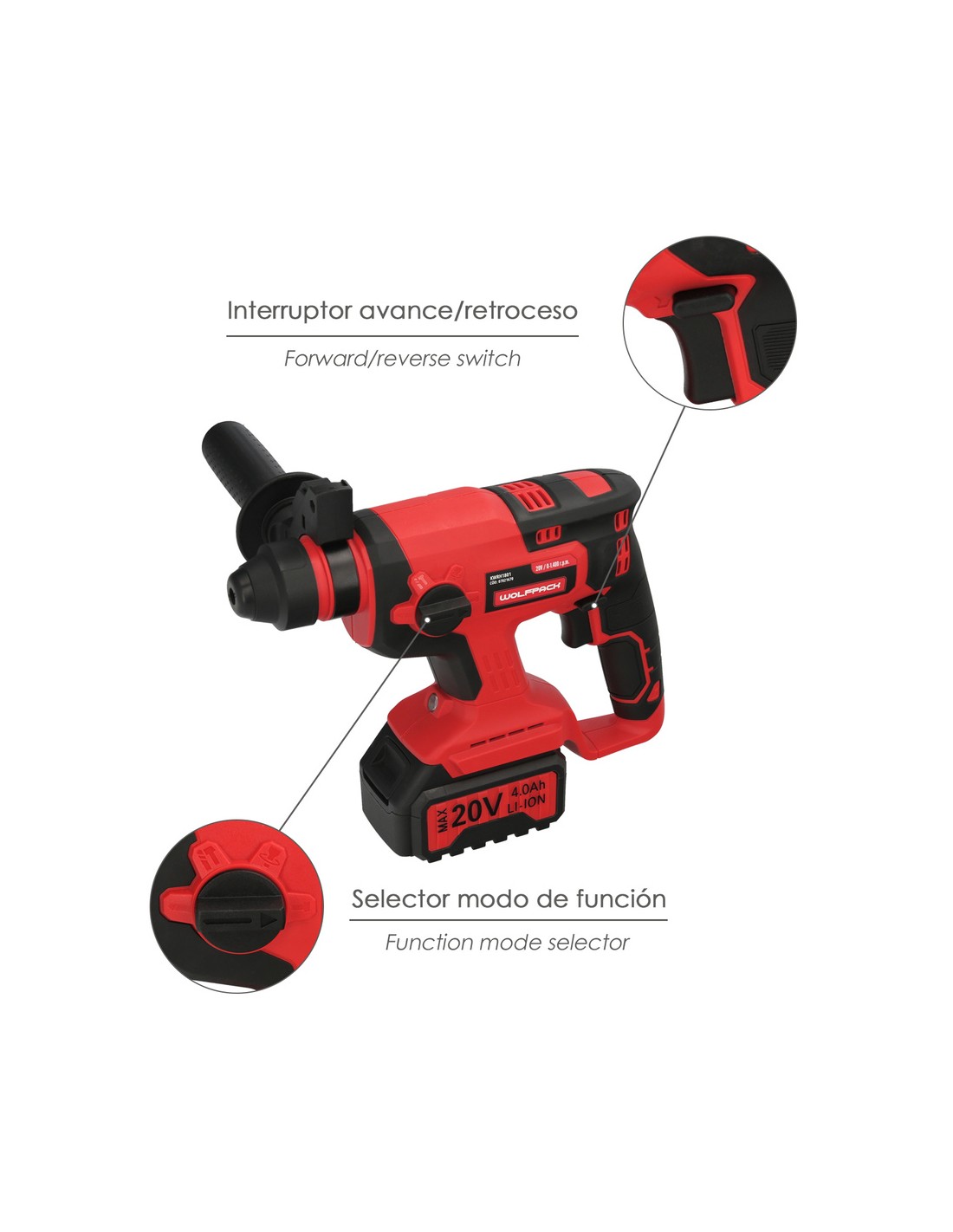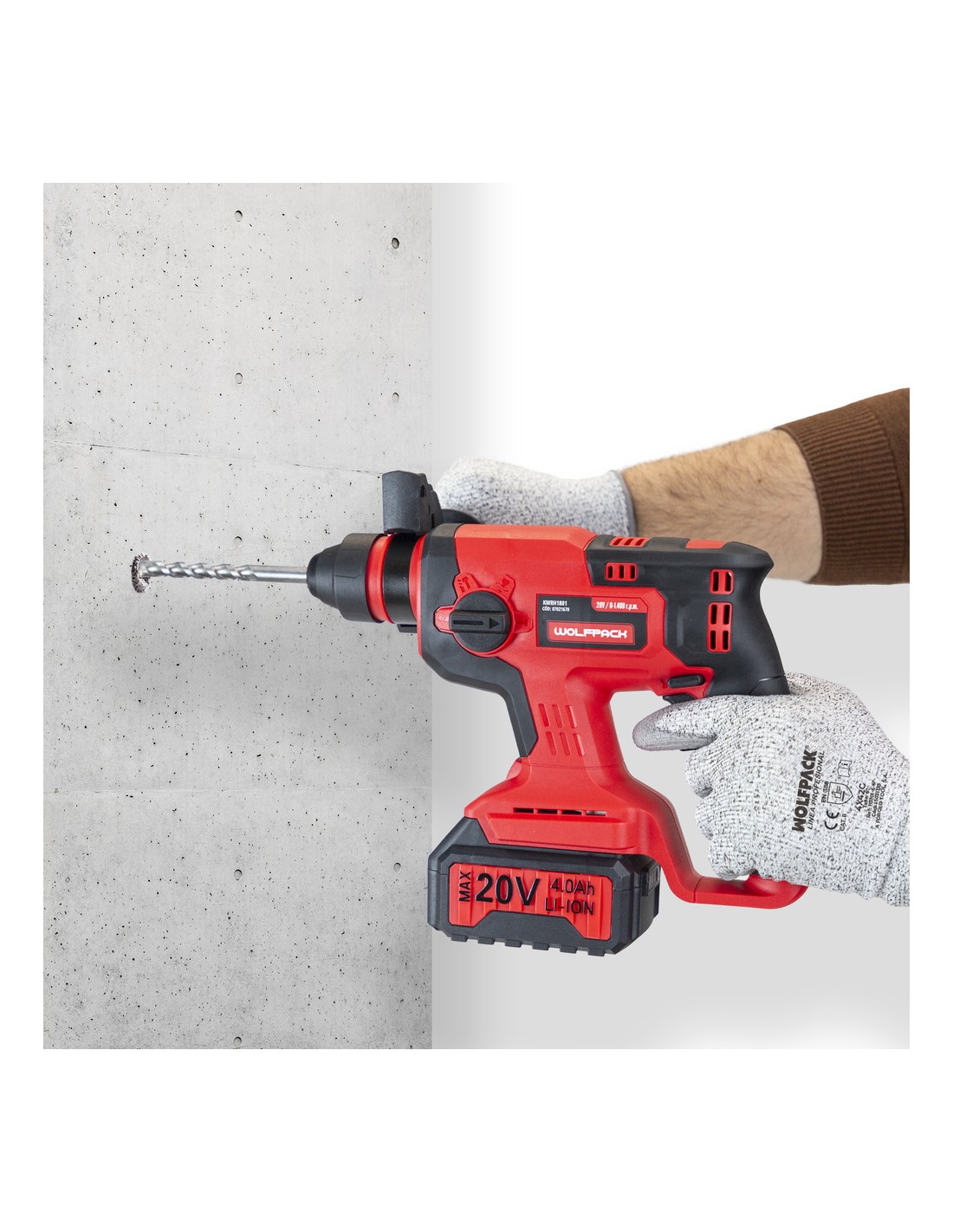 Martillo SDS PLUS A Bateria 20 Volt. Con Bateria 4.0 Ah. 1.400 R.P.M. 3 Funciones Cincelar, Perforar y Perforar con Martillo
