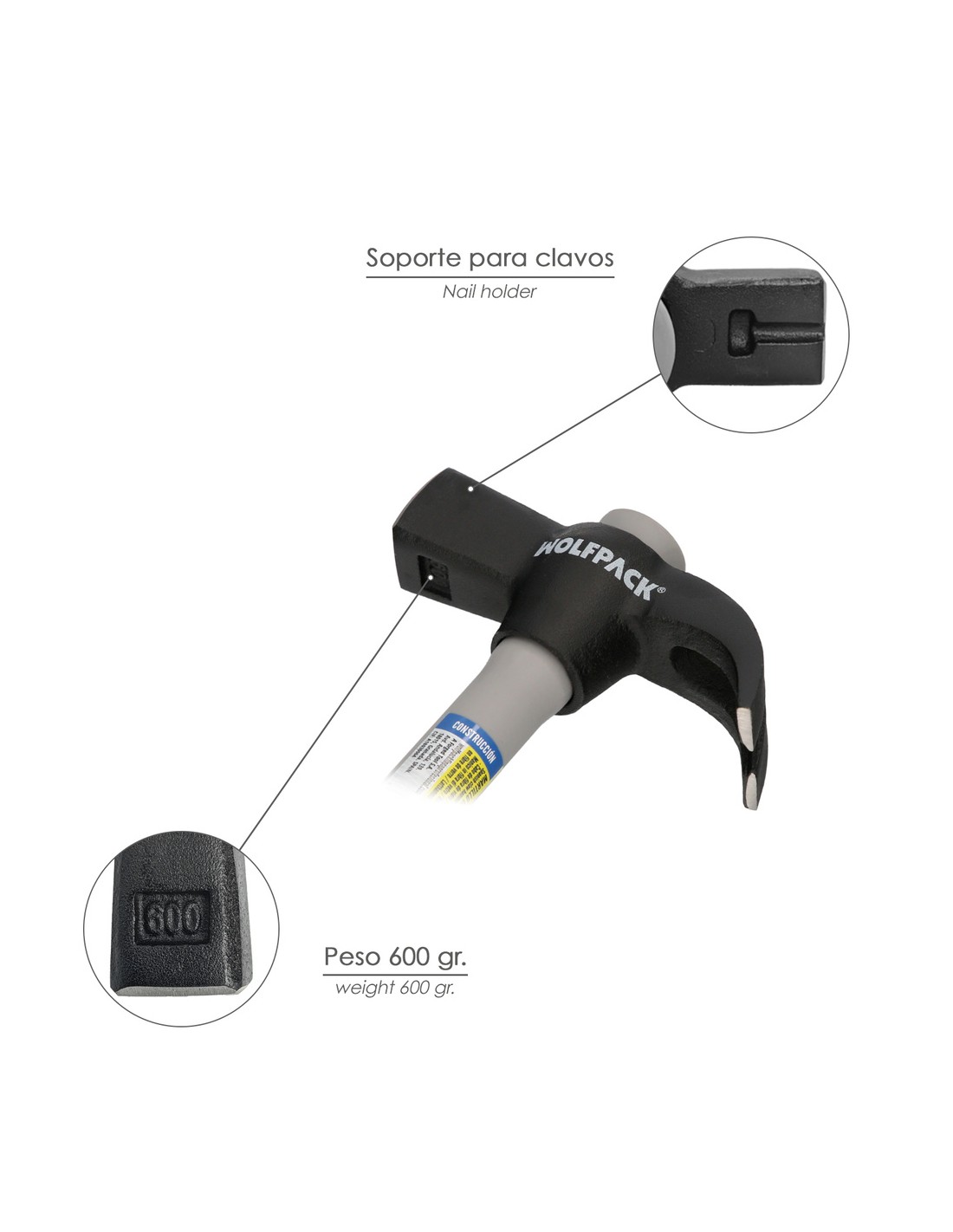 - Articulo conocido como martillo garra, martillo carpinteria, marillo doble uña, martillo encofrador, martillo construcción, martillo modelo español.