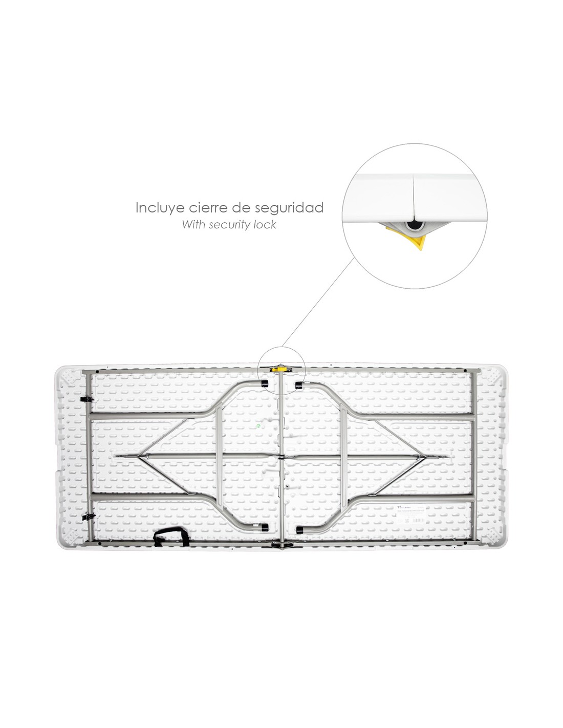 - Cuenta con cierre de seguridad para ajustar su total apertura y evitar que la mesa se cierre. Las patas también cuentan con sistema de seguridad, para que estas no se cierren de forma involuntaria.