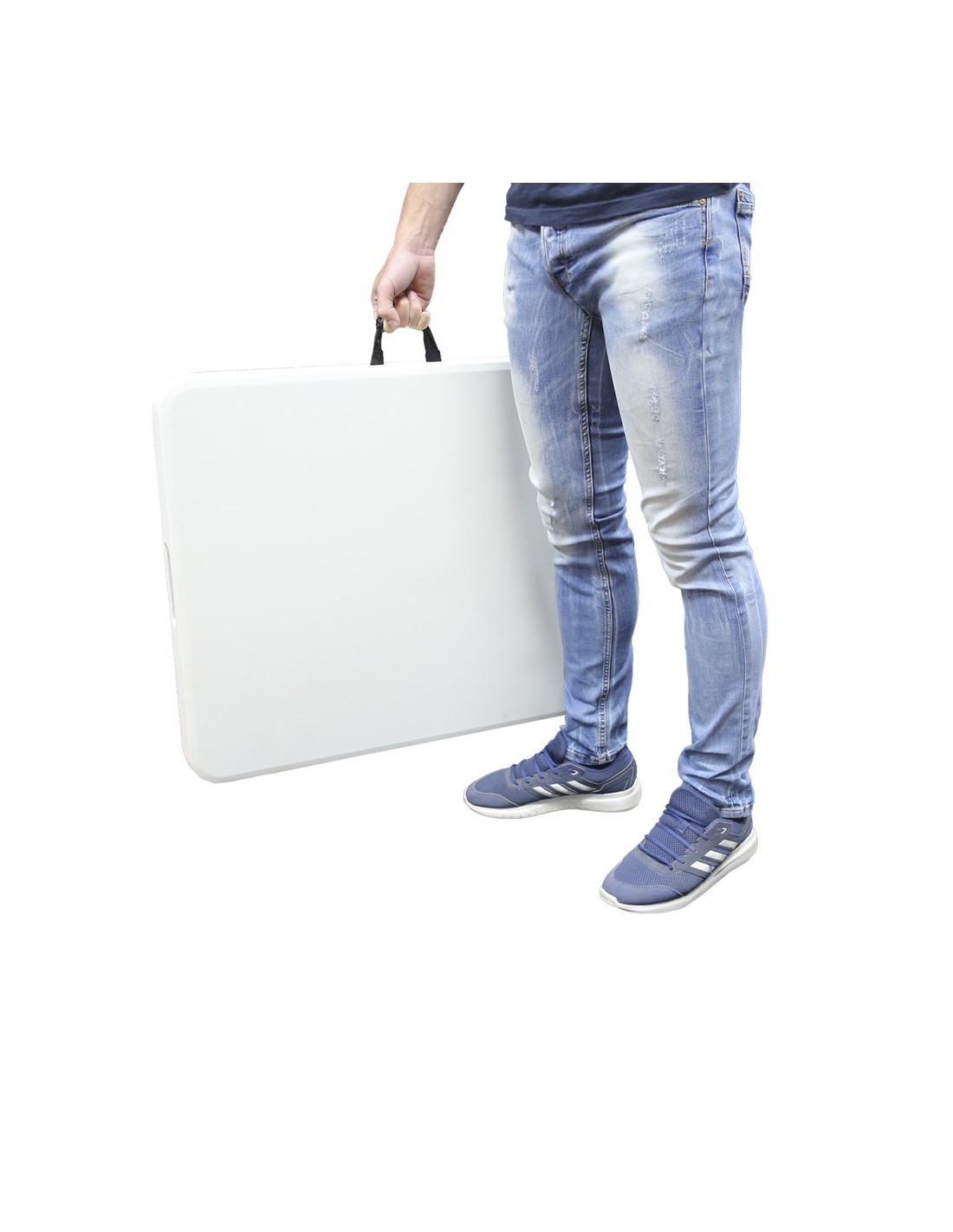 - Gracias a sus patas plegables puede ser almacenada de forma facil y sencilla, ya que una vez plegada tan solo ocupa 7,7 cm. de grosor. Ademas cuenta con un comodo asa para facilitar su transporte.