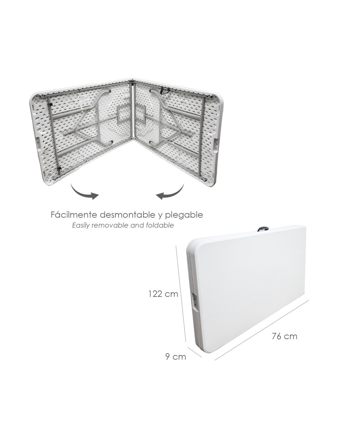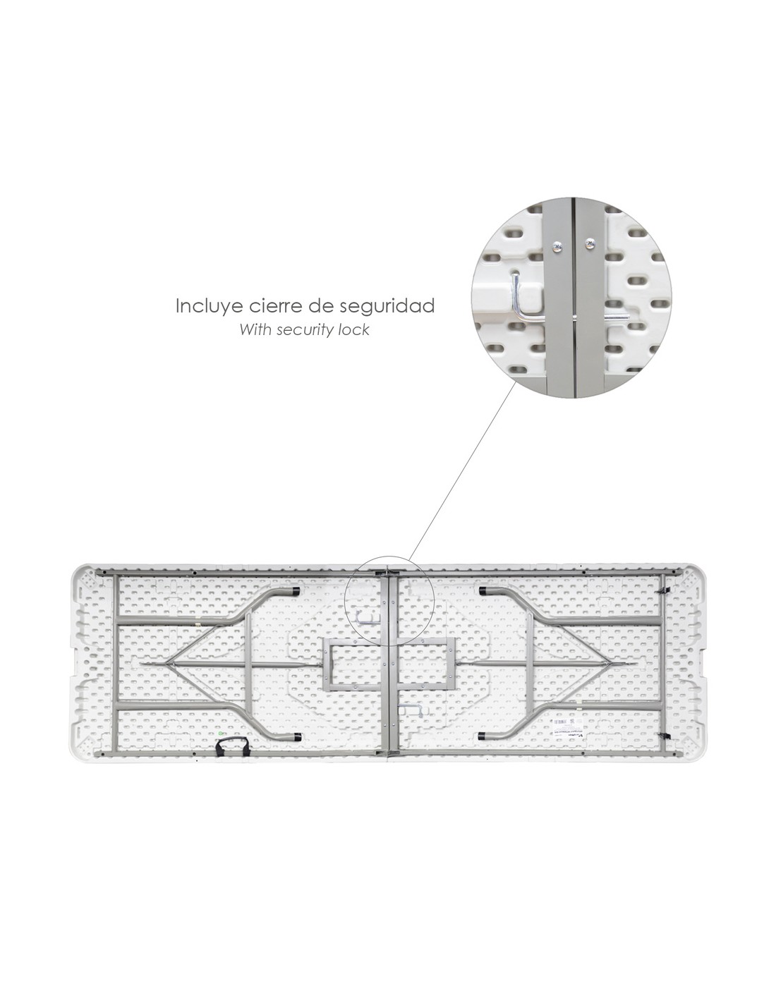 - Cuenta con cierre de seguridad para ajustar su total apertura y evitar que la mesa se cierre. Las patas también cuentan con sistema de seguridad, para que estas no se cierren de forma involuntaria.