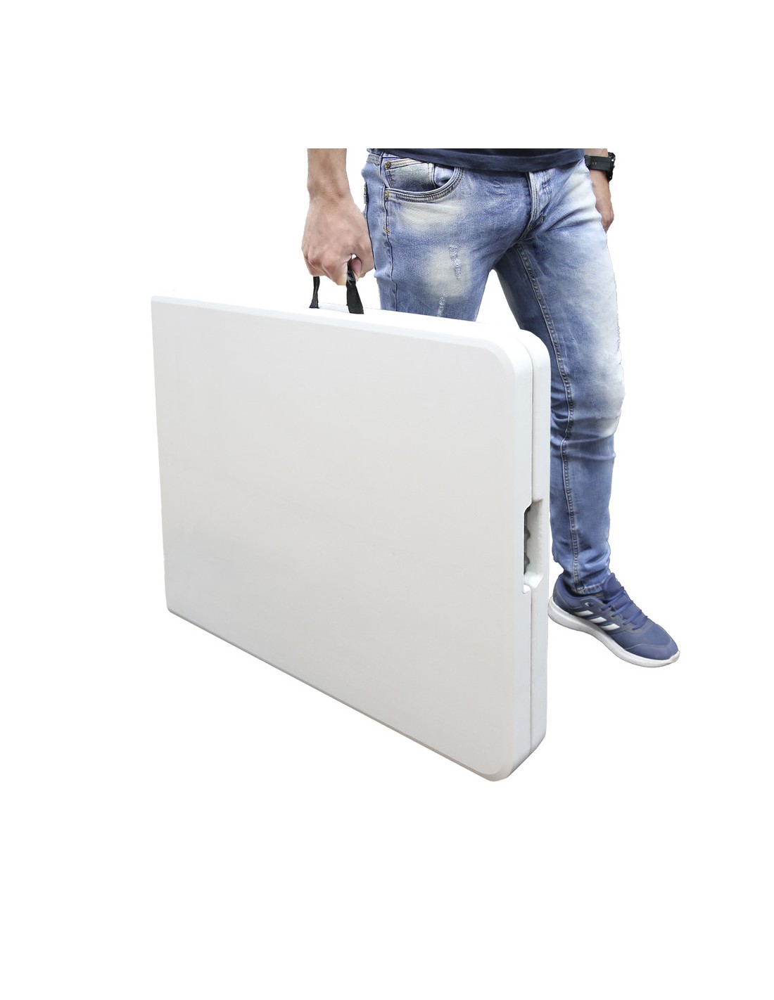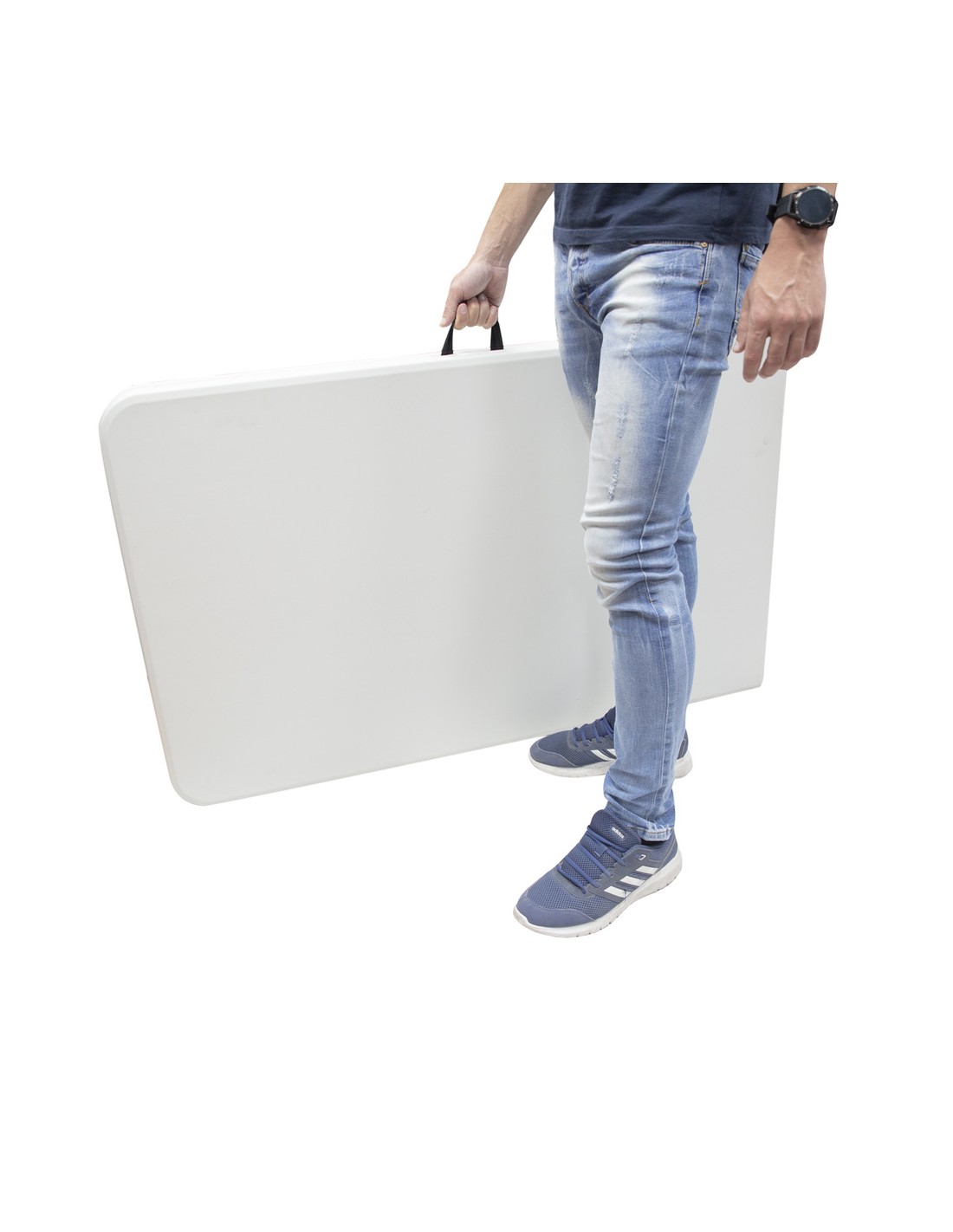 - Gracias a sus patas plegables puede ser almacenada de forma facil y sencilla, ya que una vez plegada tan solo ocupa 9 cm. de grosor. Ademas cuenta con un comodo asa para facilitar su transporte.