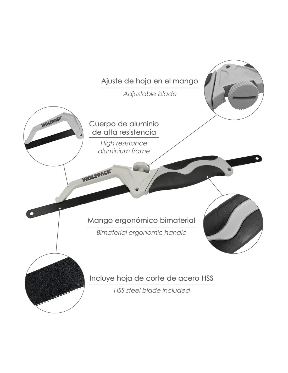 Mini Sierra Empuñadura Aluminio Con Hoja 300 mm. Ajustable, Hoja Corte HSS, Serrucho, Segueta, Segueta, Mini Arco Sierra