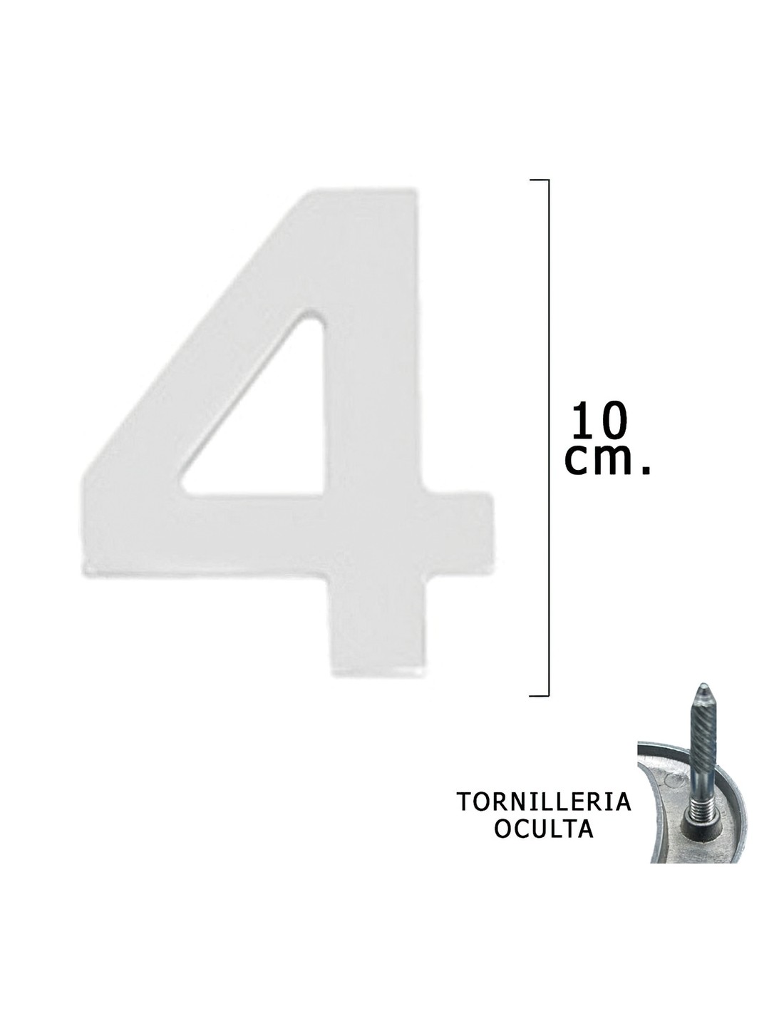 Numero Metal "4 Plateado Mate 10 cm. con Tornilleria Oculta (Blister 1 Pieza)