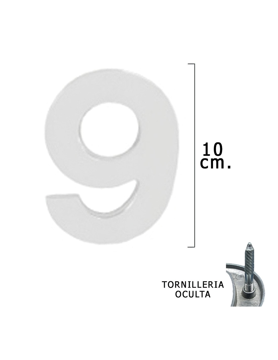 Numero Metal "9" Plateado Mate 10 cm. con Tornilleria Oculta (Blister 1 Pieza)