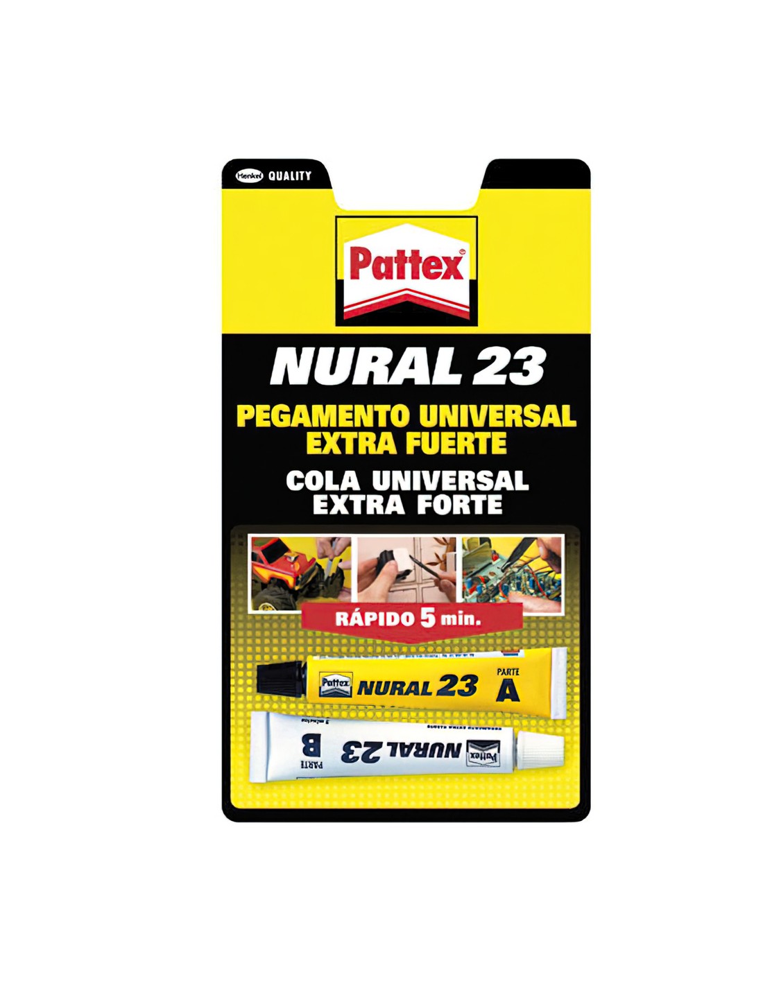- Color del producto: translúcido. Se adhiere a cristal, vidrio, fibra de vidrio, madera, aglomerados, porcelana, cerámica, mármol, piedra, metales, corcho, cartón, tejidos, fieltro y plásticos (PVC, metacrilato, baquelita, policarbonato expandido). No es apto para polietileno, polipropileno ni ptfe. Pattex Nural 23 pega, repara y rellena de forma permanente. Una vez endurecido puede ser lijado, pulido, tratado y mecanizado.