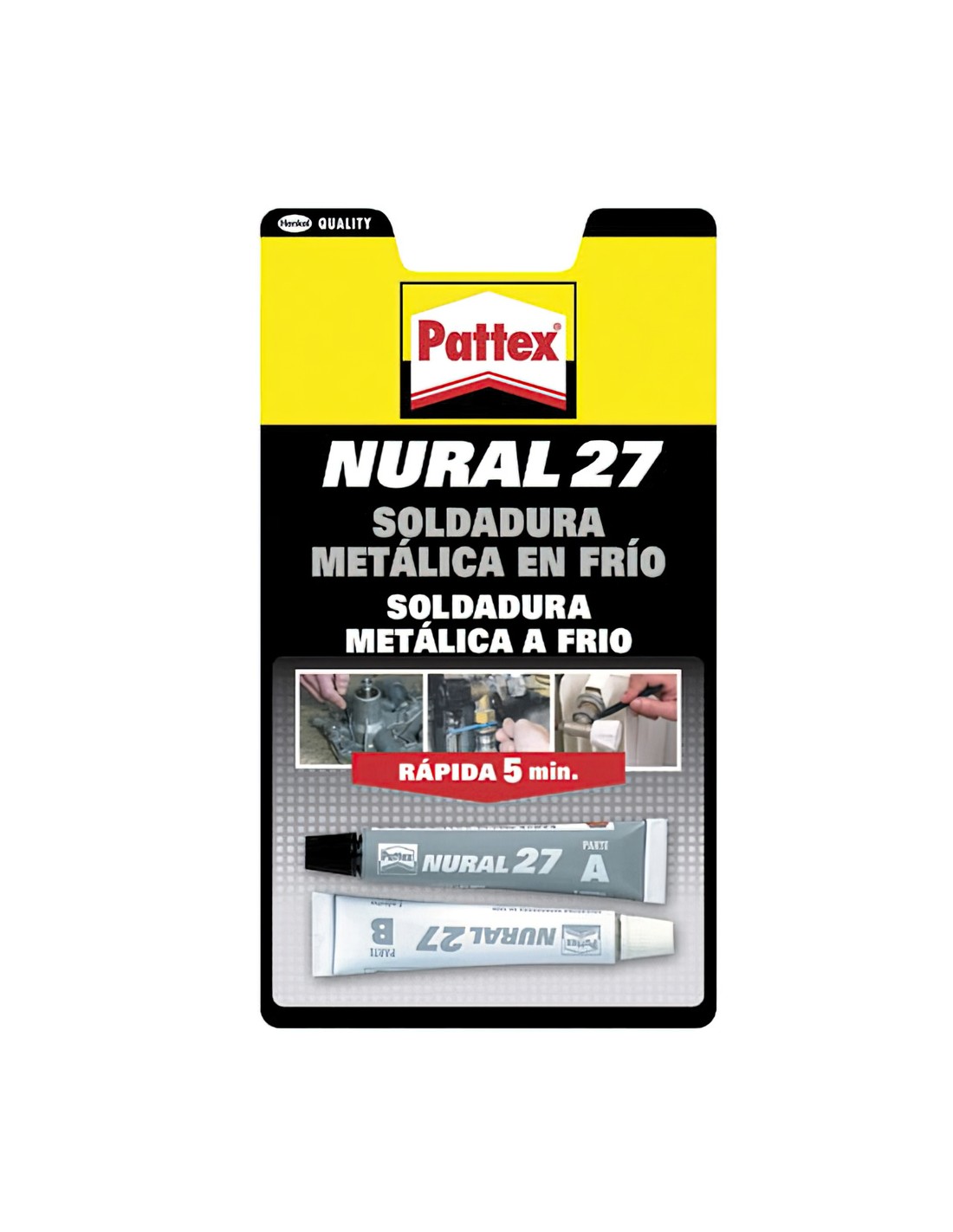 - Color del producto: gris. Pattex Nural 27 pega, repara y rellena de forma permanente. Una vez endurecido puede ser lijado, pulido, tratado, mecanizado y pintado. Resulta idóneo para tapar grietas y fugas entuberías, depósitos y piezas metálicas. Se adhiere a hierro, acero, acero inoxidable, acero cromado, acero niquelado, aluminio, cobre, latón, estaño y plomo. También es adecuado para vidrio, cristal, fibra de vidrio, plásticos, madera, mármol, cemento, y uralita.