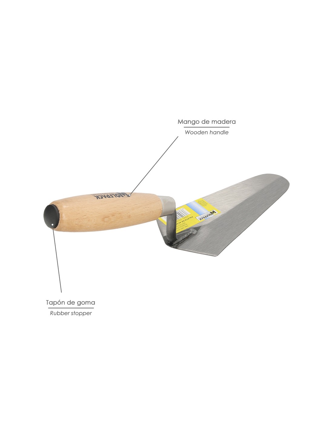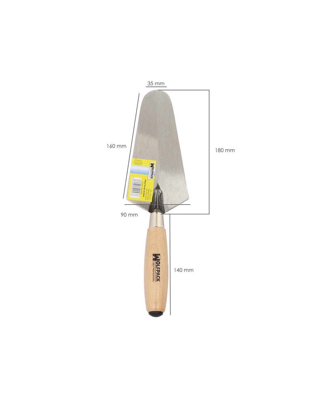 Paleta Wolfpack mango de madera 348 / 180 mm. - Medida: 180 mm. - Mango de madera barnizado. - El mango incluye una pieza de plástico para pequeños golpes de ajuste. - Artículo también conocido como: palustra.