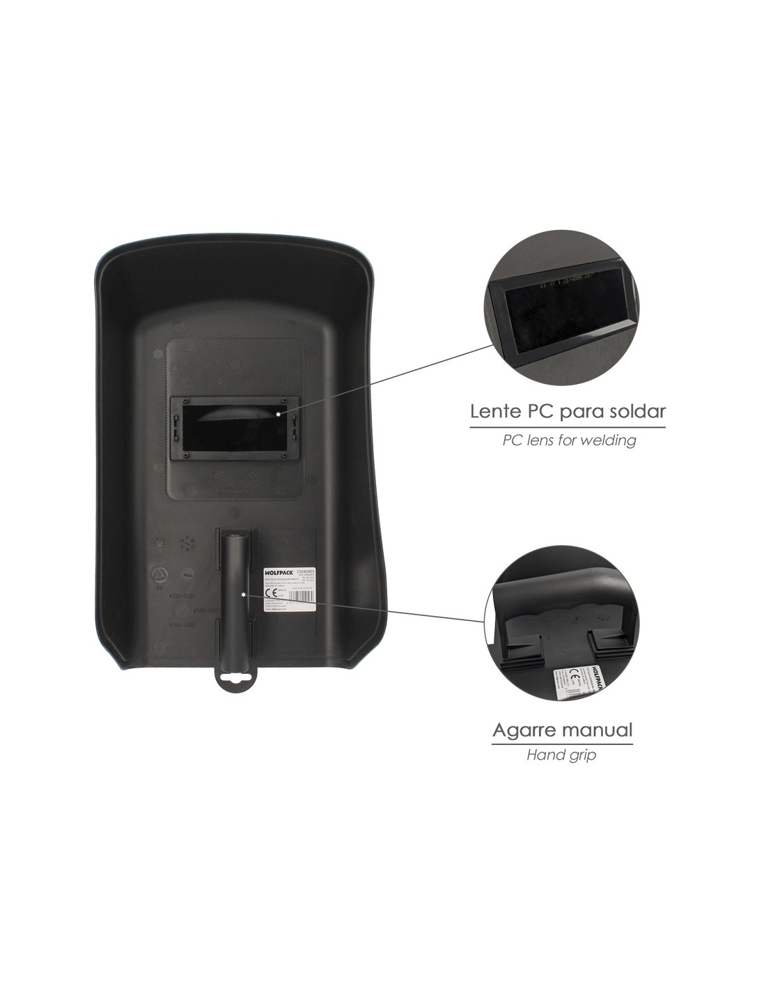 Pantalla soldadura de mano. - Material: fibra de vidrio negra con poliester. - Ocular filtrante y cubre filtro rectangulares grado 11. - Sujección manual por el interior de la pantalla. - Articulo conodico como pantalla soldar, pantalla soldador.