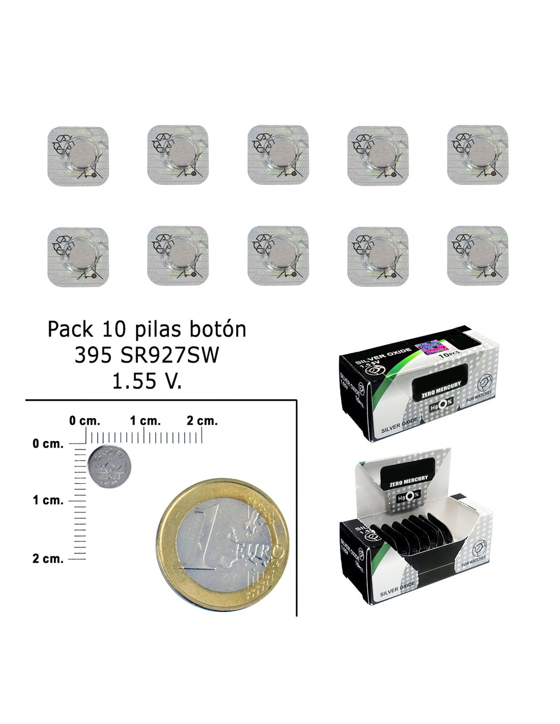 Pila boton oxido de Plata - Caja con 10 pilas. - Tension: 1.55 v. - Para aplicaciones que precisan de un consumo de energía constante: relojes, calculadoras, pequeños electrodomesticos. - Pilas realizadas sin mercurio.