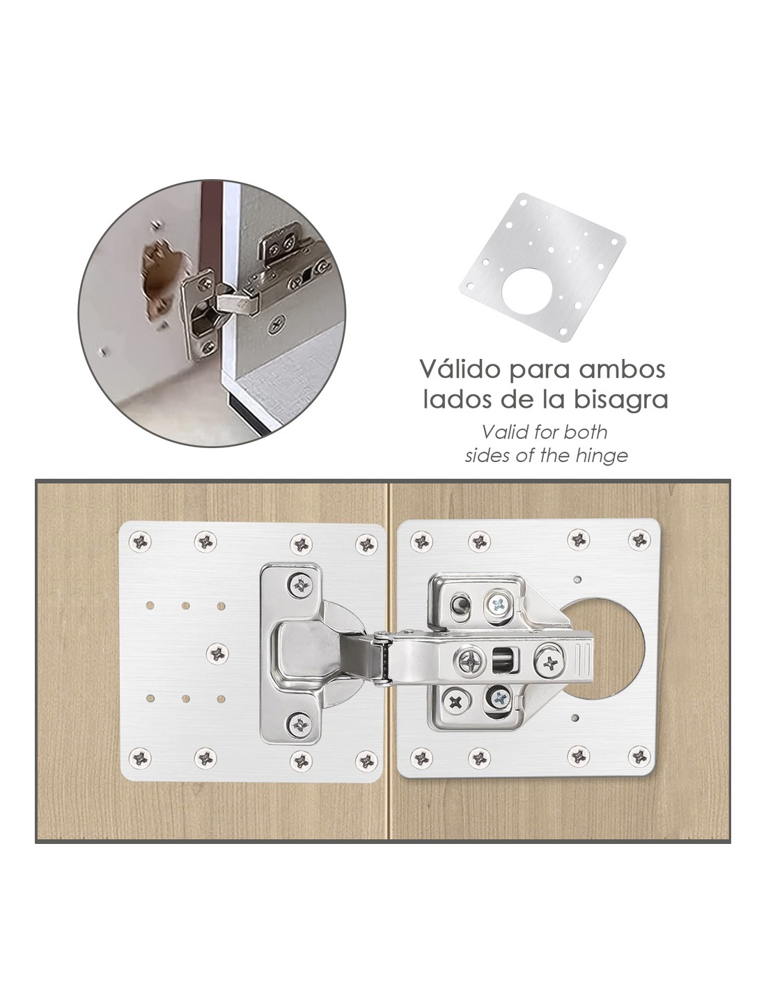 - Compatible con la gran mayoria de bisagras, ya que los orificiós están diseñados para coincidir con la mayoria de bisagras.