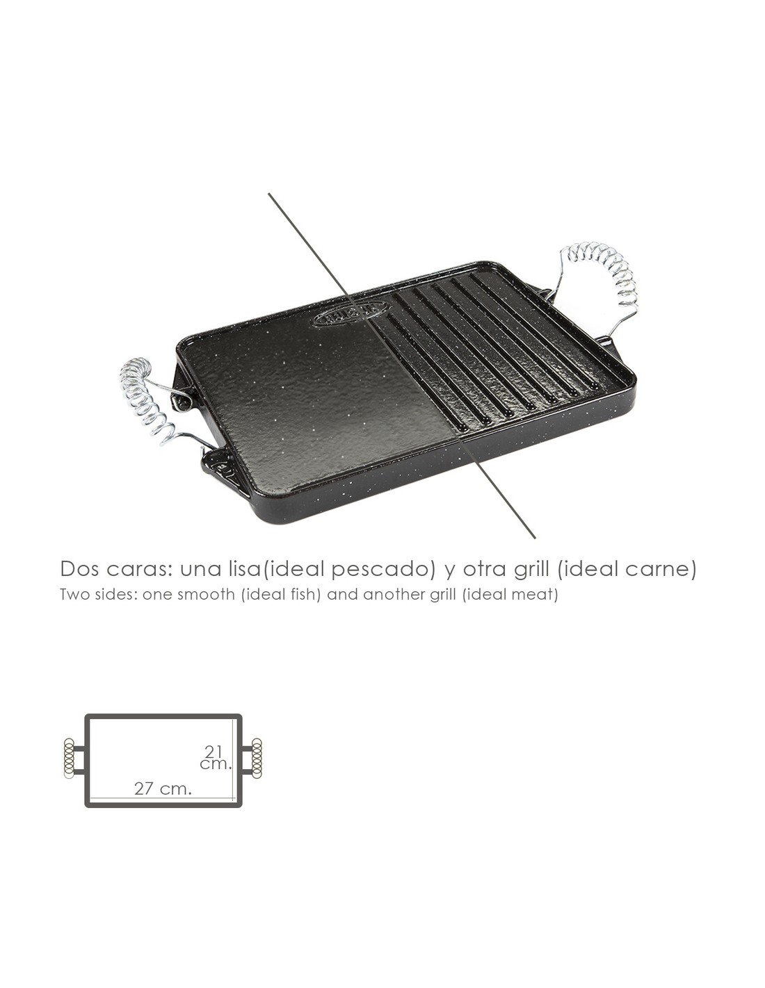 - Doble cara una lisa y otra con grill, ideal para hacer pescados con la cara lisa y carnes con el grill.