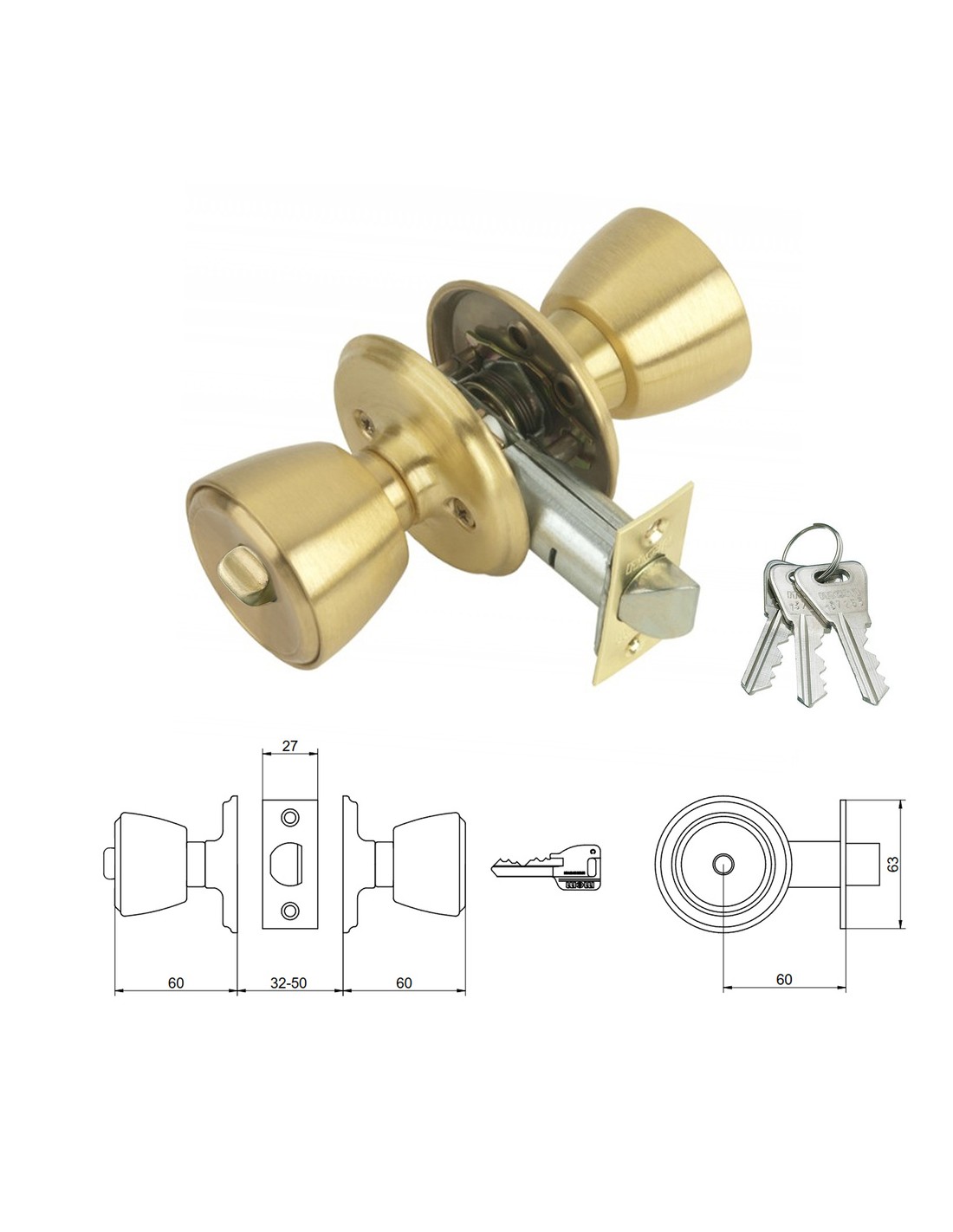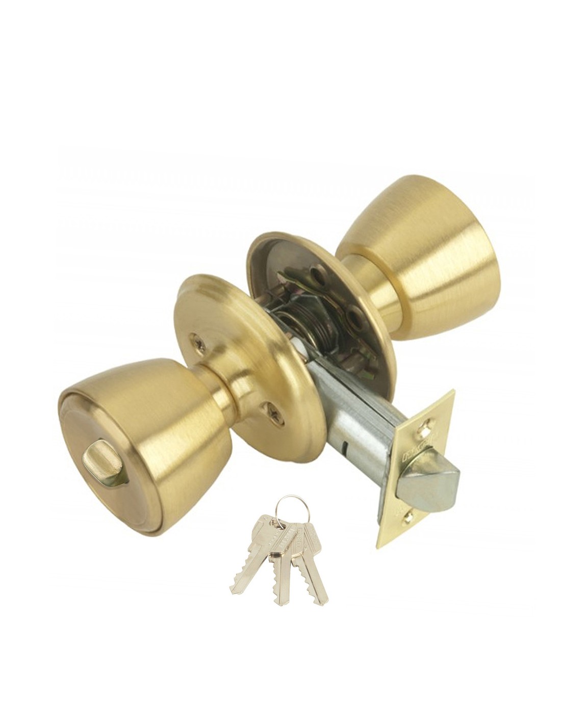- Cerradura de pomo con picaporte. Pomo libre con llave por el exterior y pomo libre con condena por el interior.