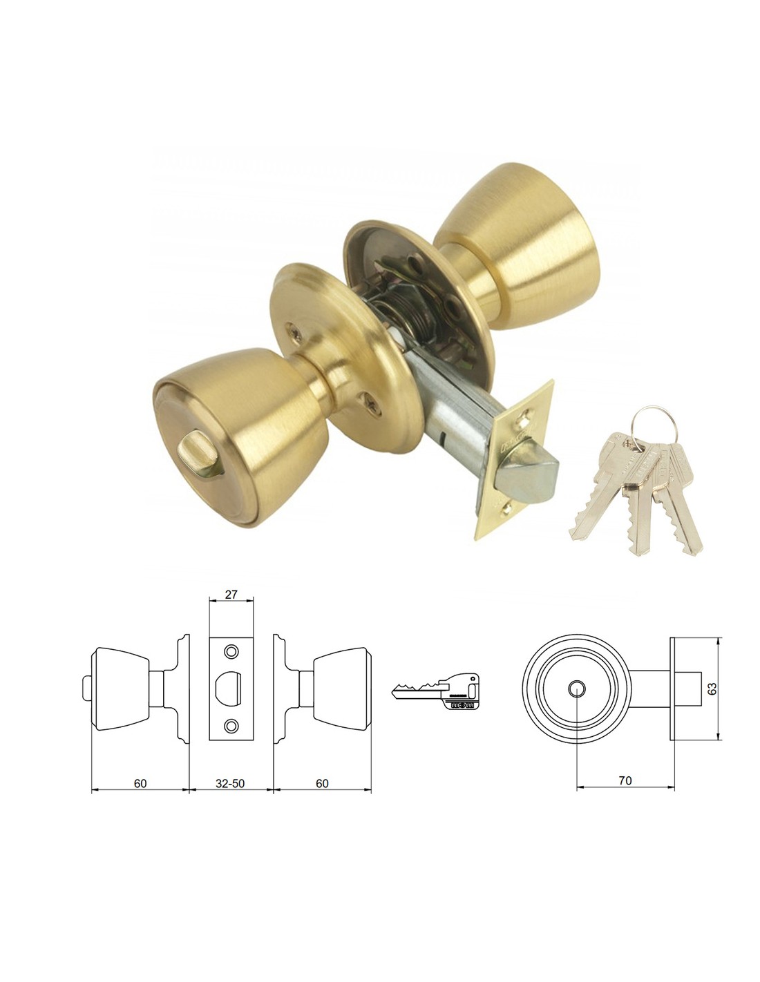 - Cerradura de pomo con picaporte. Pomo libre con llave por el exterior y pomo libre con condena por el interior.