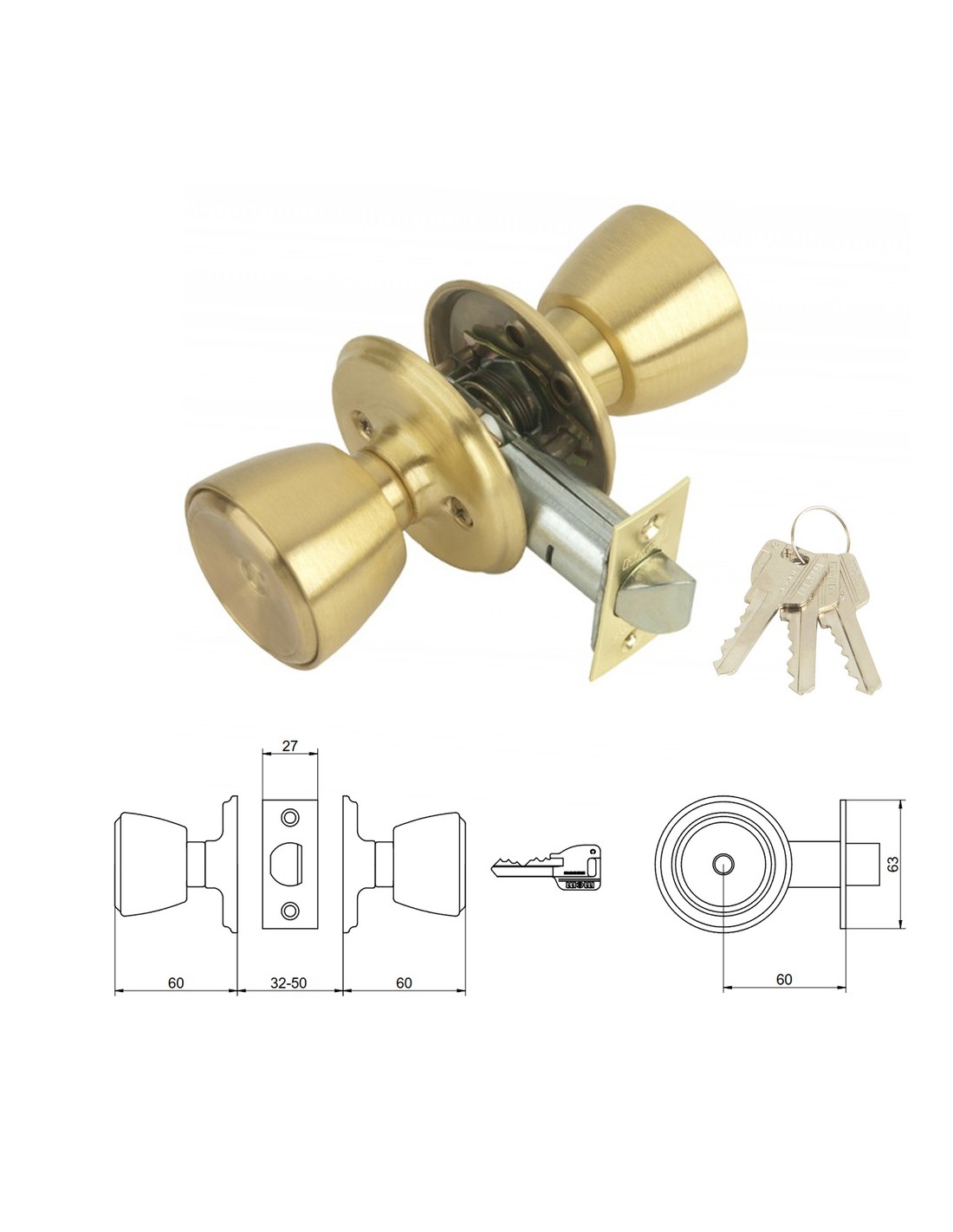 - Cerradura de pomo con picaporte. Pomo fijo con llave por el exterior y pomo libre por el interior