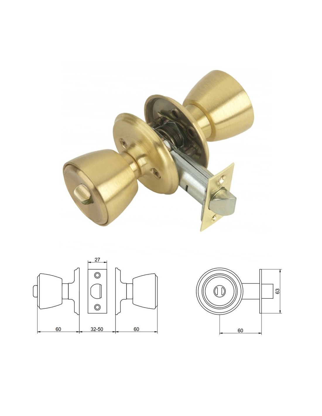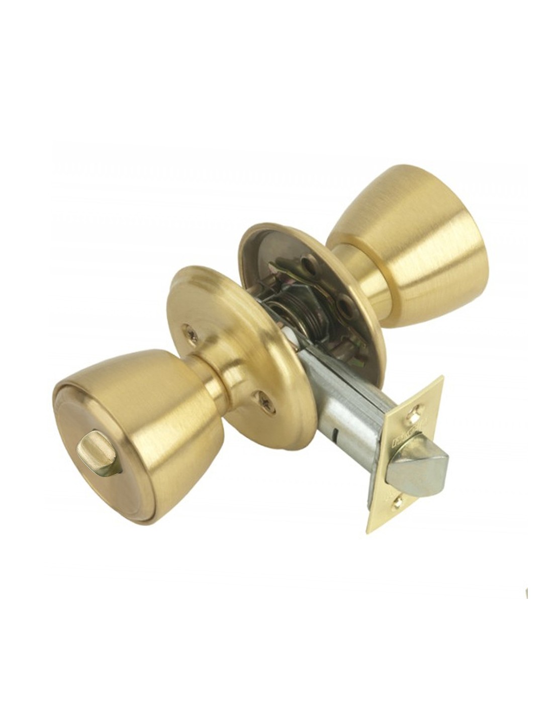 - Cerradura de pomo para puertas con condena con picaporte. Pomo libre con posibilidad de entrada de emergencia por el exterior y pomo libre con condena con botón por el interior.
