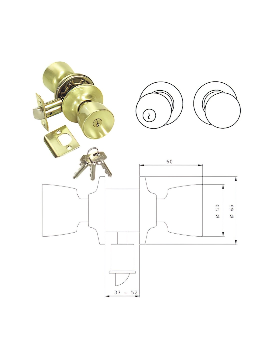 Pomo Tesa 3502-LM/60/70. - Para entrada: el exterior fijo, sólo se abre con llave. El interior siempre se puede abrir. - Medida: 60/70. - Acabado latón mate.