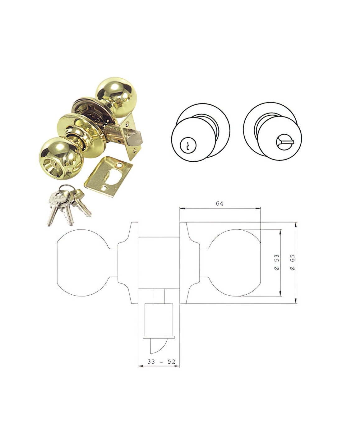 Pomo Tesa 3900-lp/60 - Entrada: ambos lados son condenados y descondenados por la llave exterior o la muletilla interior. - Ideal para colocar en puertas de entrada. - Acabado latón pulido.