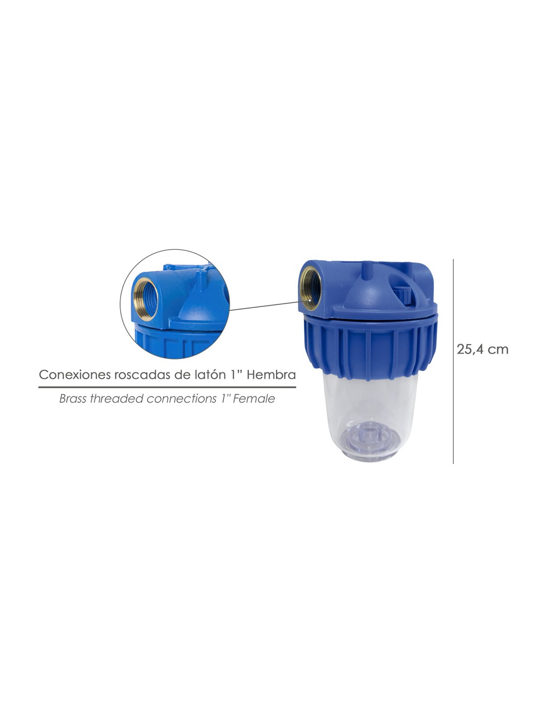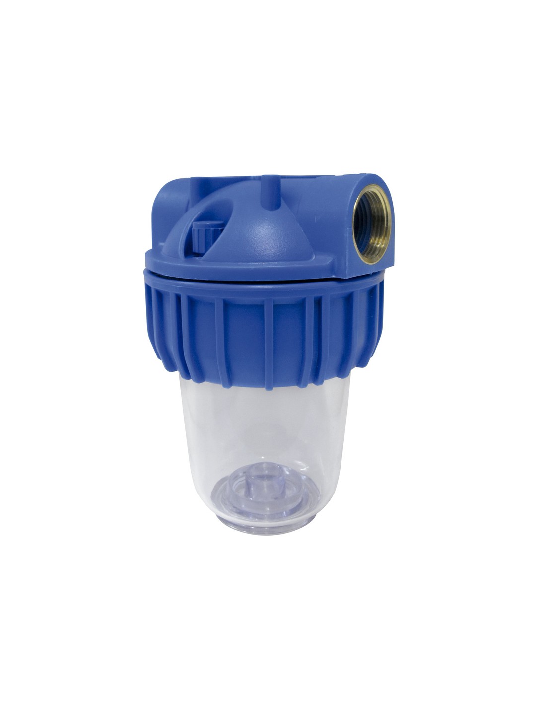 Filtro porta cartuchos 5" conexion 1". - Filtro para lavadoras, calentadores, lavar coches, regar, etc. - Material plástico de color transparente y azul. - Medida 5" - 12,5cm. - Articulo tambien conocido como filtro agua, porta filtros.