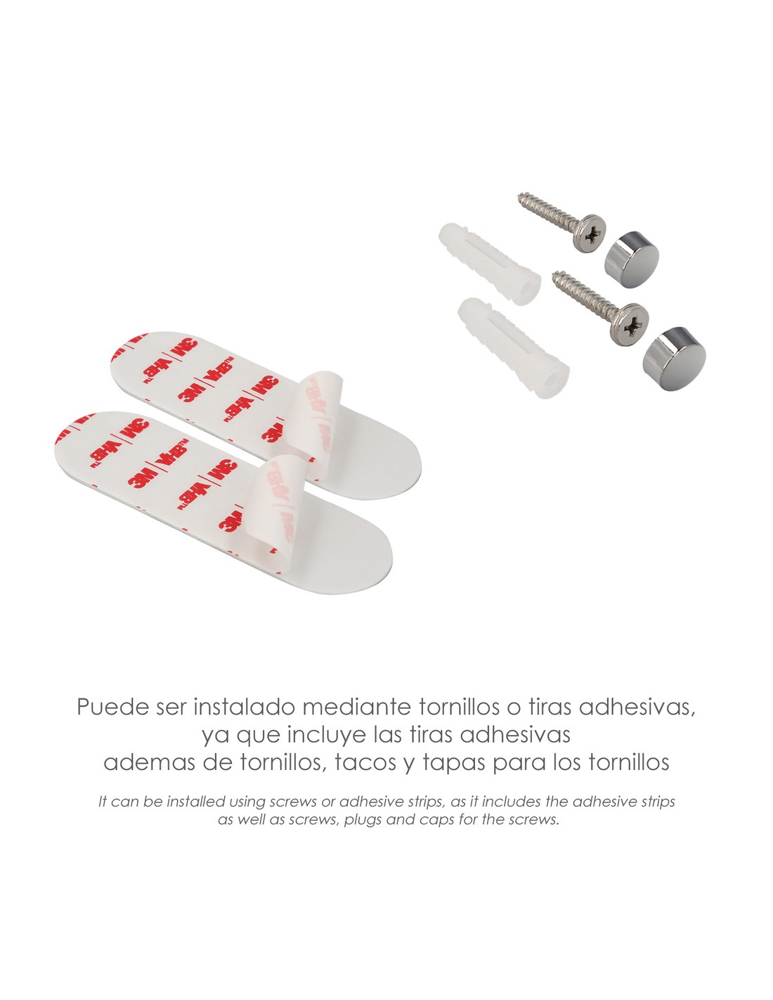 - Gracias a su cinta autoadhesiva es muy facil de instalar, sin necesidad de herramientas ni tornillos. Tambien puede ser instalado mediante tornillos y tacos, que también estan incluidos.