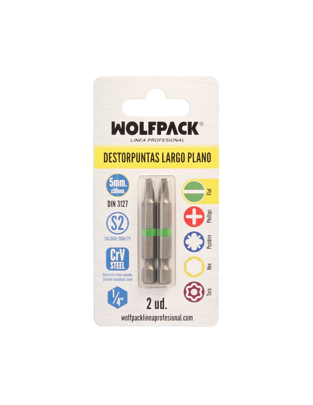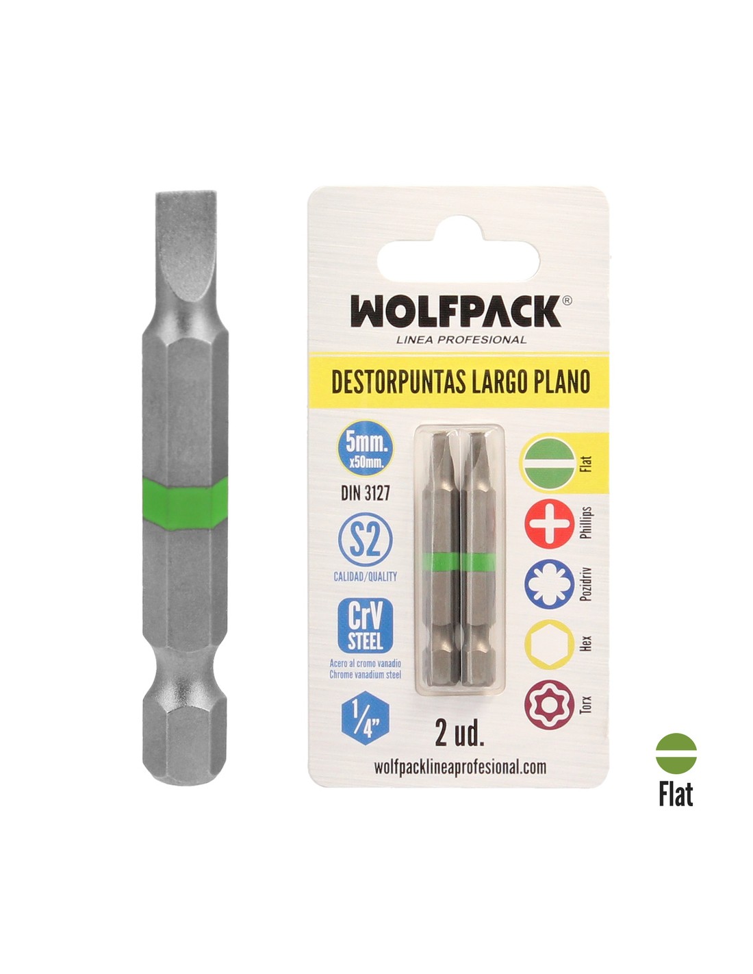 Puntas Destornillador Largo Plano 5 mm. (2 Piezas). Acero S2 al Cromo Vanadio. Puntas Hexagonales, Destorpuntas,