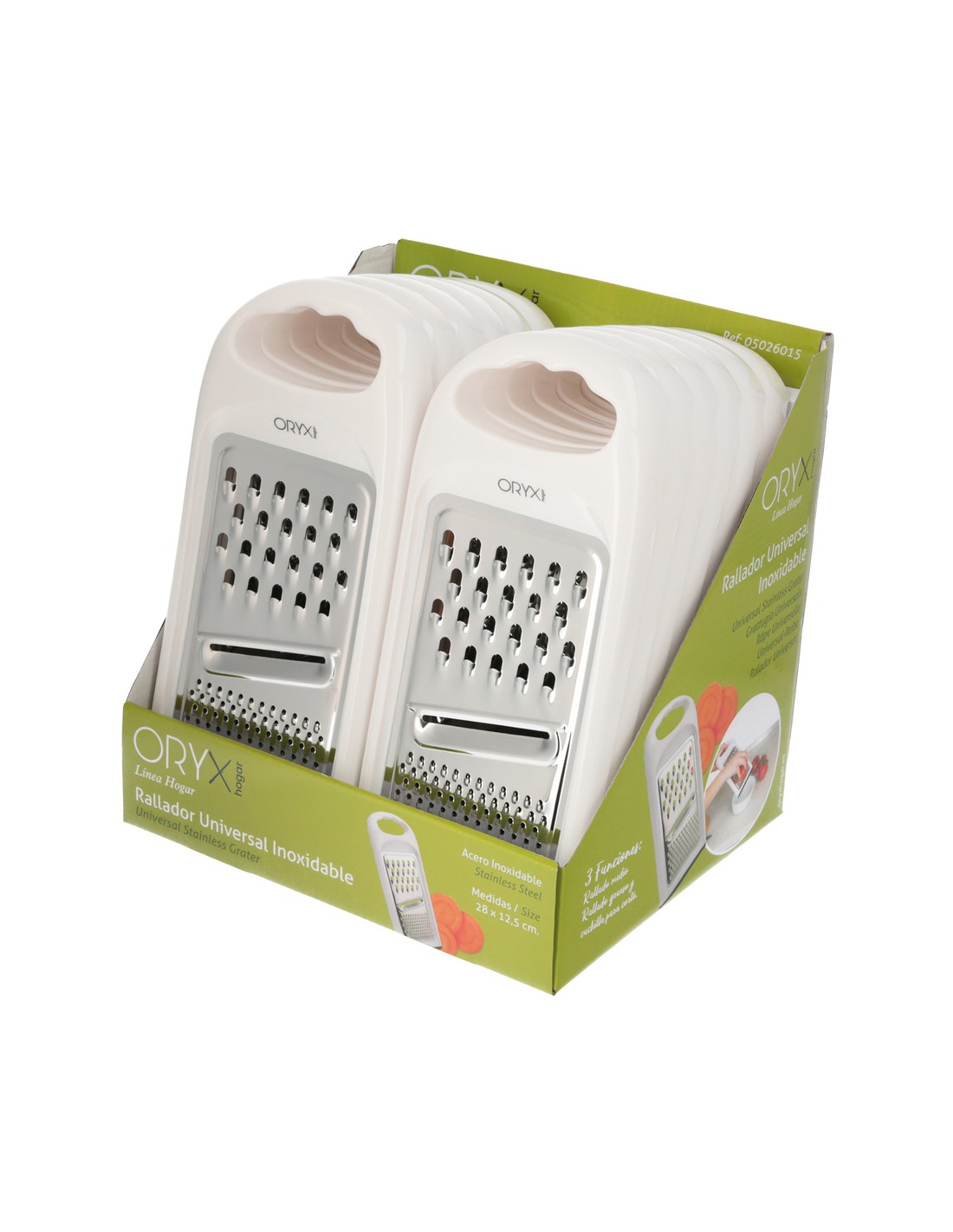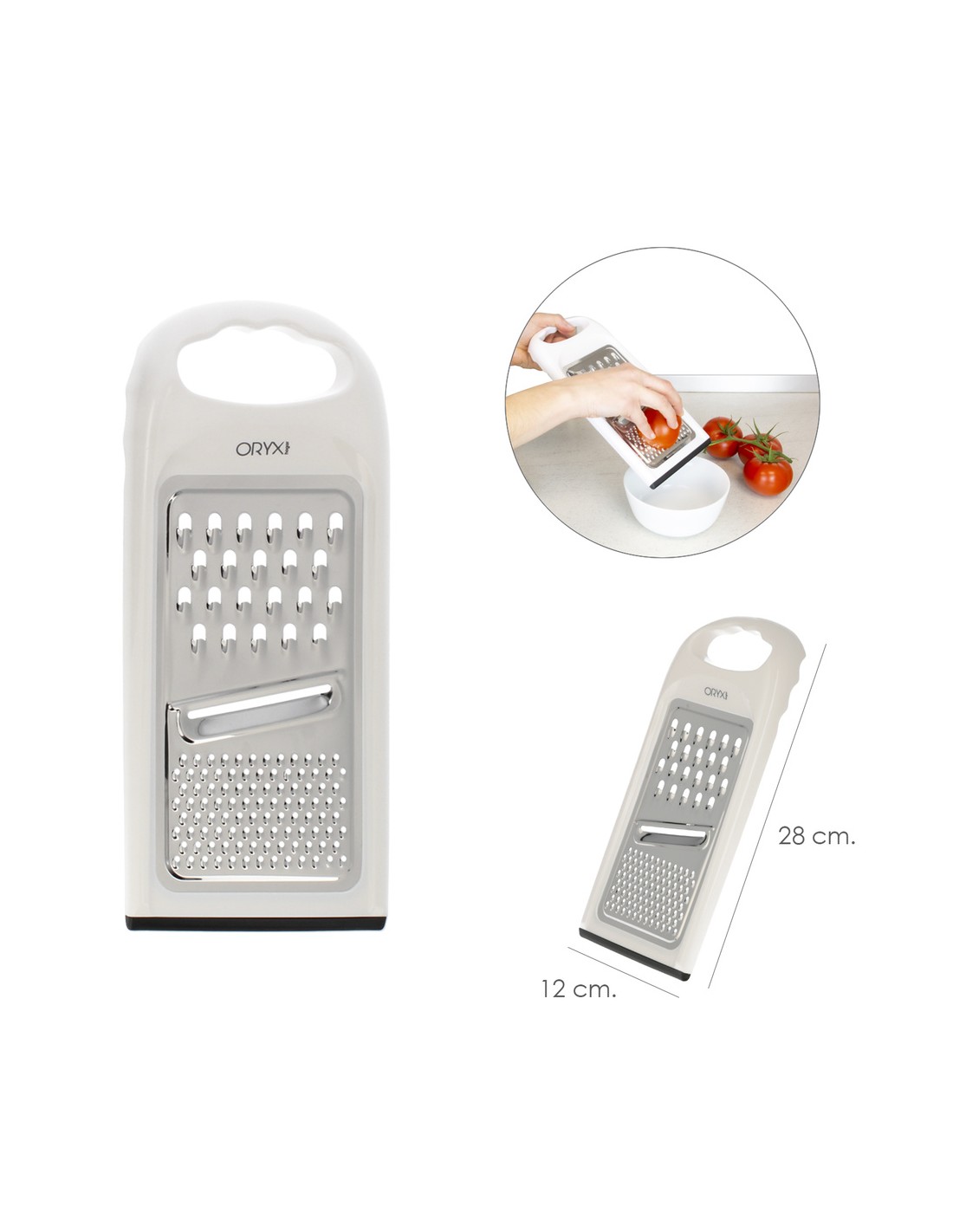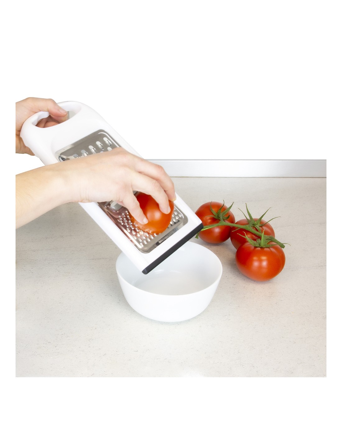 - Rallador de acero inoxidable con cuerpo de plástico blanco ABS y base antideslizante.